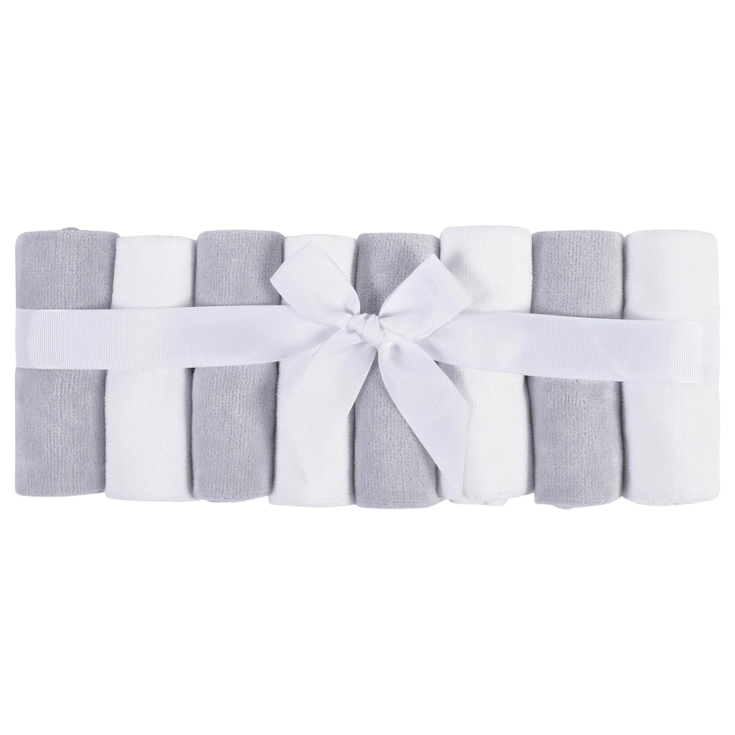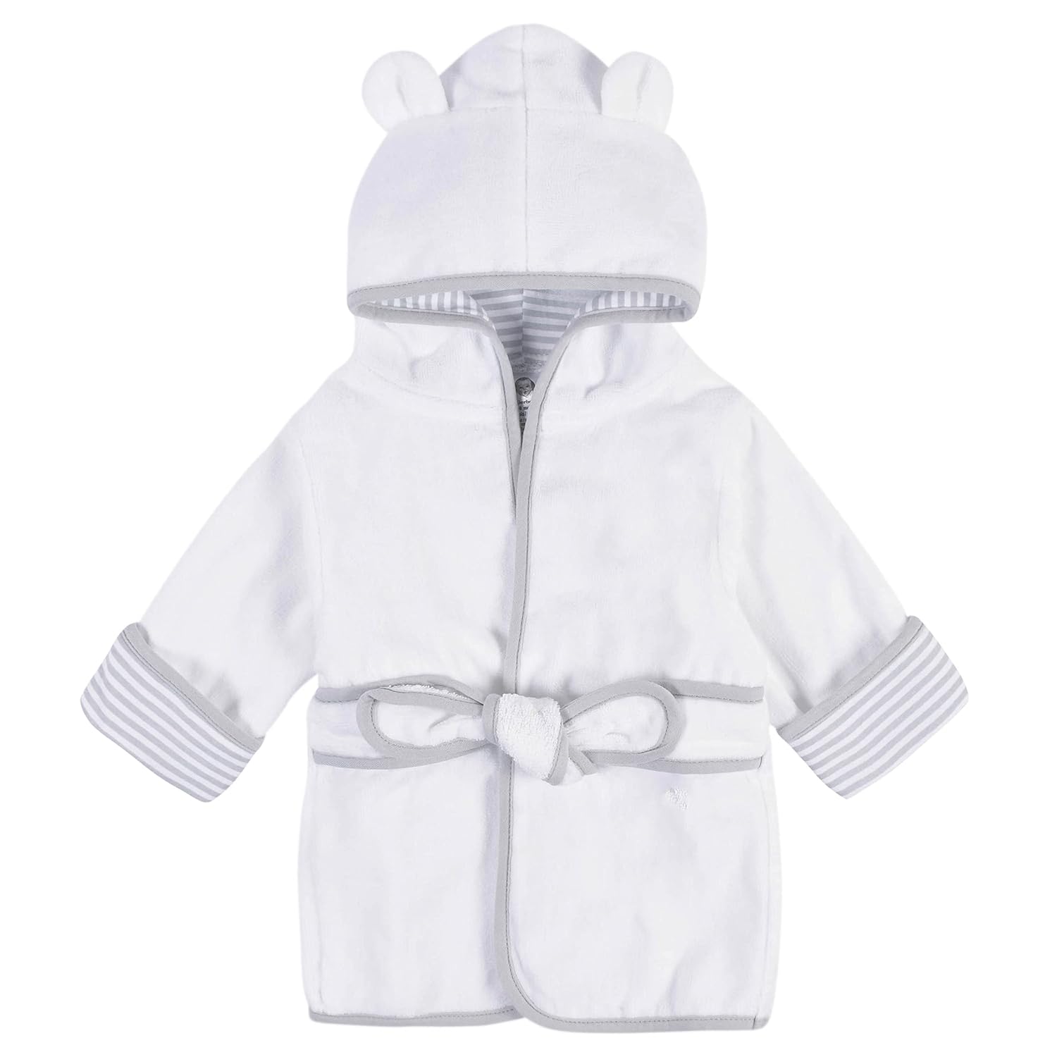 Includes one bear hooded baby towel, one baby robe with ears, four white baby washcloths, & four gray baby washcloths