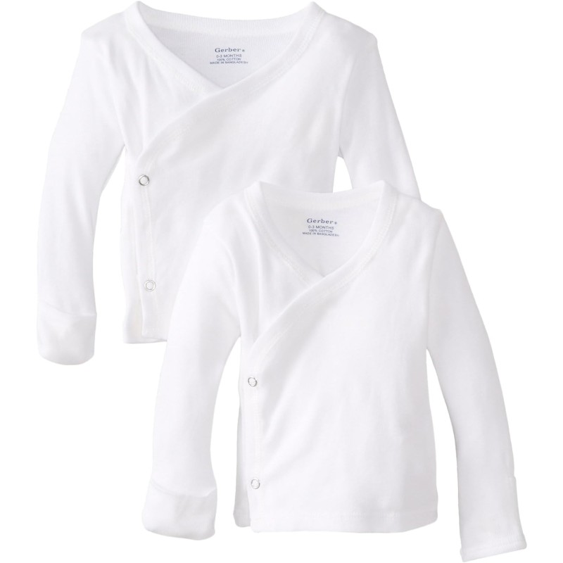 Gerber long sleeve side snap shirts are great as a layering piece, made of 100 percent cotton for comfort and softness, designed with snaps on the side for no-fuss dressing because they do not have to go over baby's head and have built-in mitten cuffs to prevent scratching, 3 pack white available in sizes newborn and 0-3 months, machine wash and dry, great item for gift giving