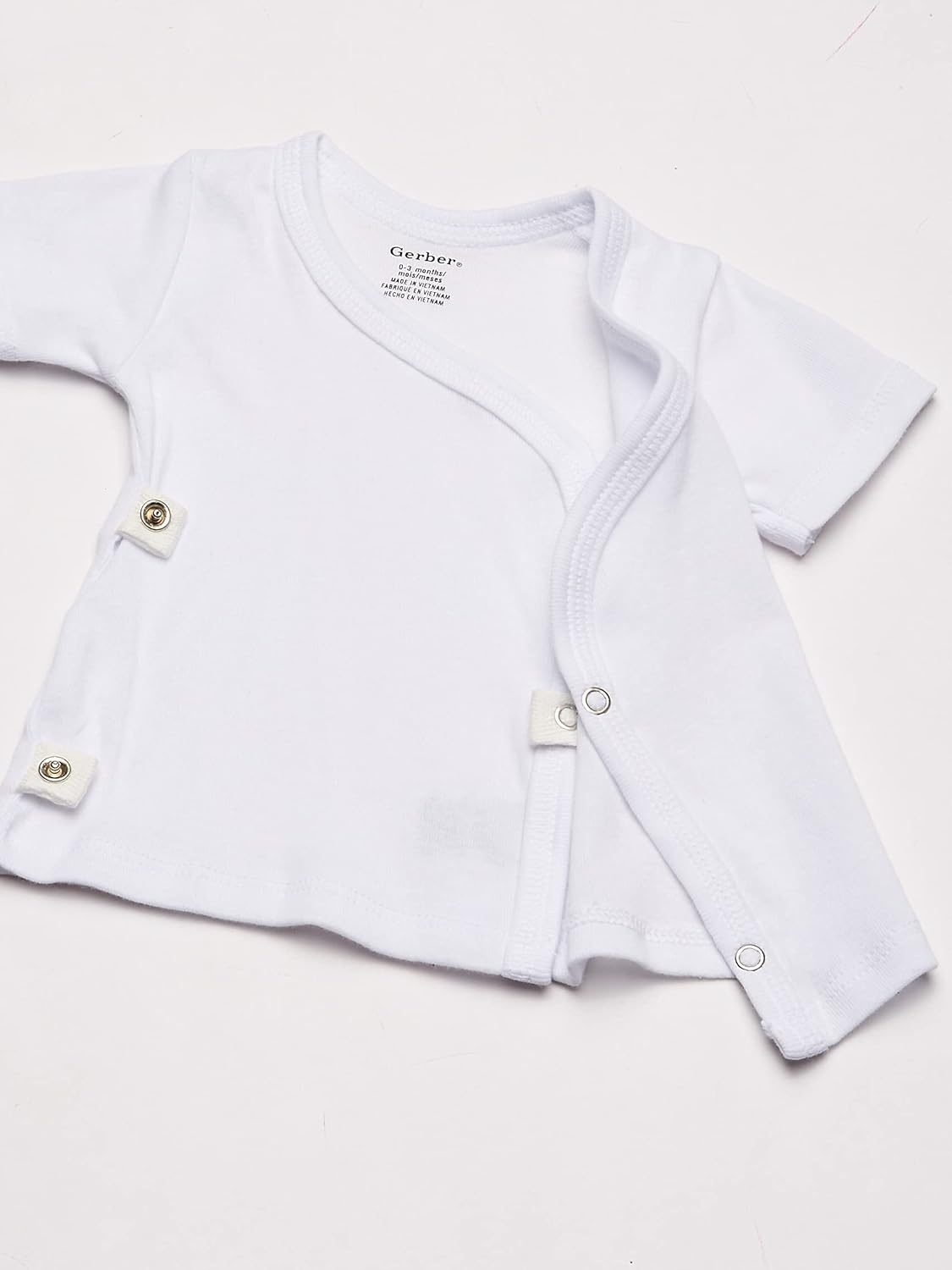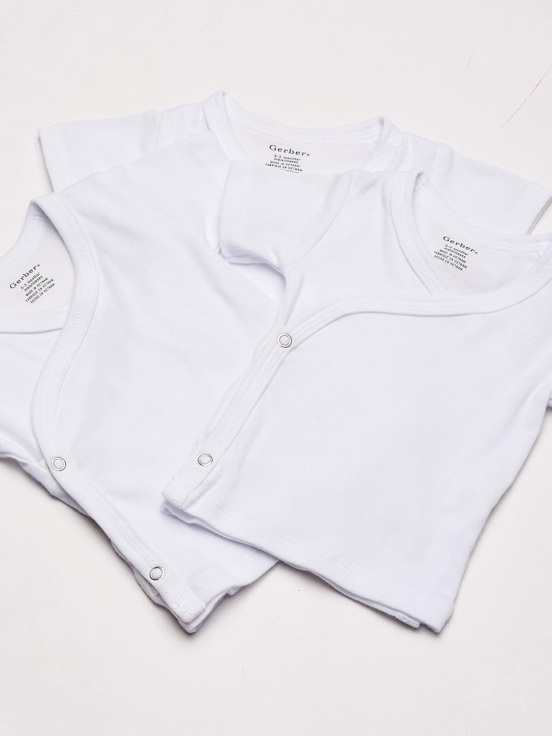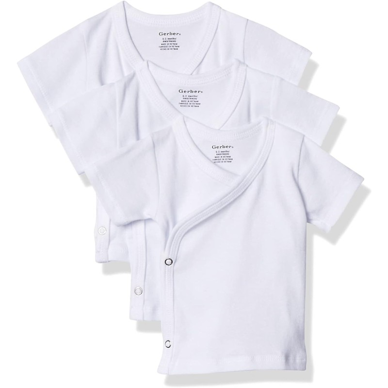 Gerber short sleeve side snap shirts are great as a layering piece, made of 100 percent cotton for comfort and softness, designed with snaps on the side for no-fuss dressing because they do not have to go over baby's head, 3 pack white available in sizes newborn and 0-3 months, machine wash and dry, great item for gift giving