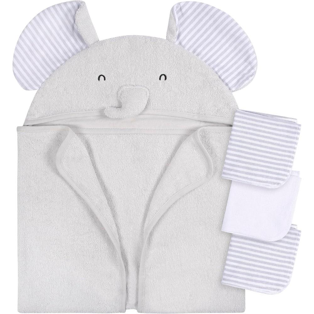 Gerber Baby 4 Piece Animal Character Hooded Towel and Washcloth Set, Brown Lion, One Size(Grey Elephant)