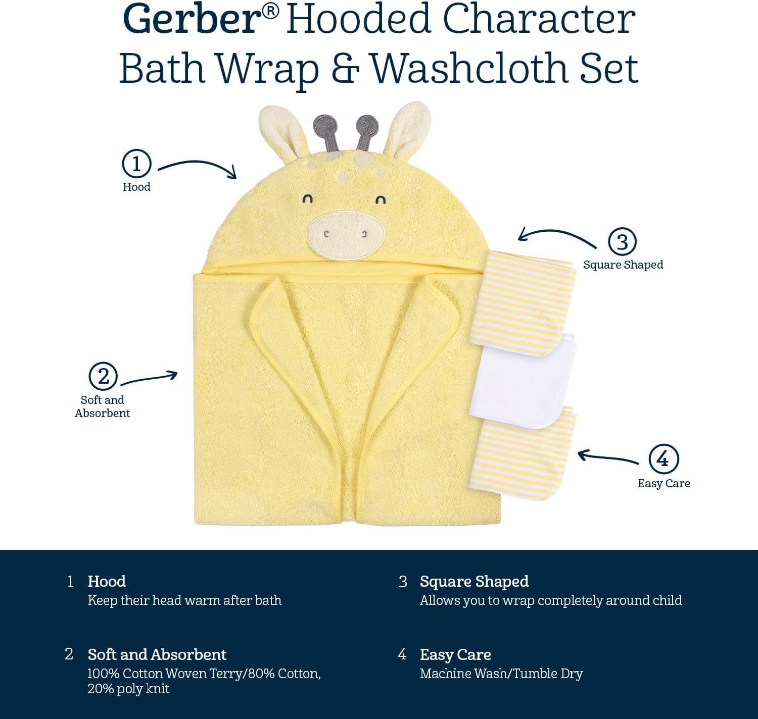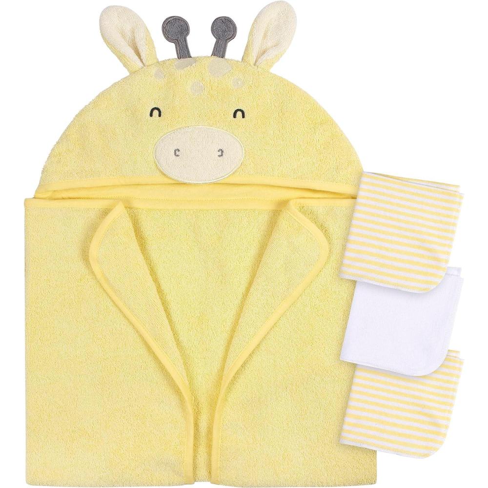 Gerber Baby 4 Piece Animal Character Hooded Towel and Washcloth Set, Brown Lion, One Size(Yellow Giraffe)
