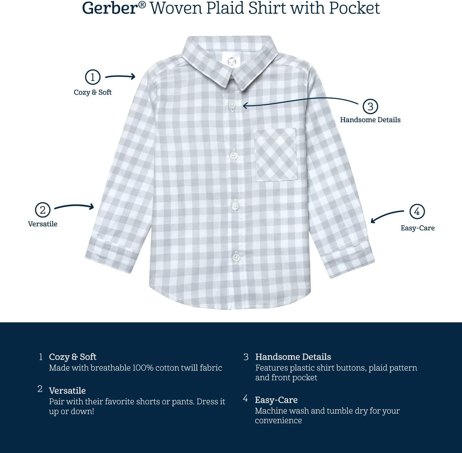 Gerber Baby and Toddler Boys Long Sleeve Button Up Plaid Shirt(Gray Plaid)