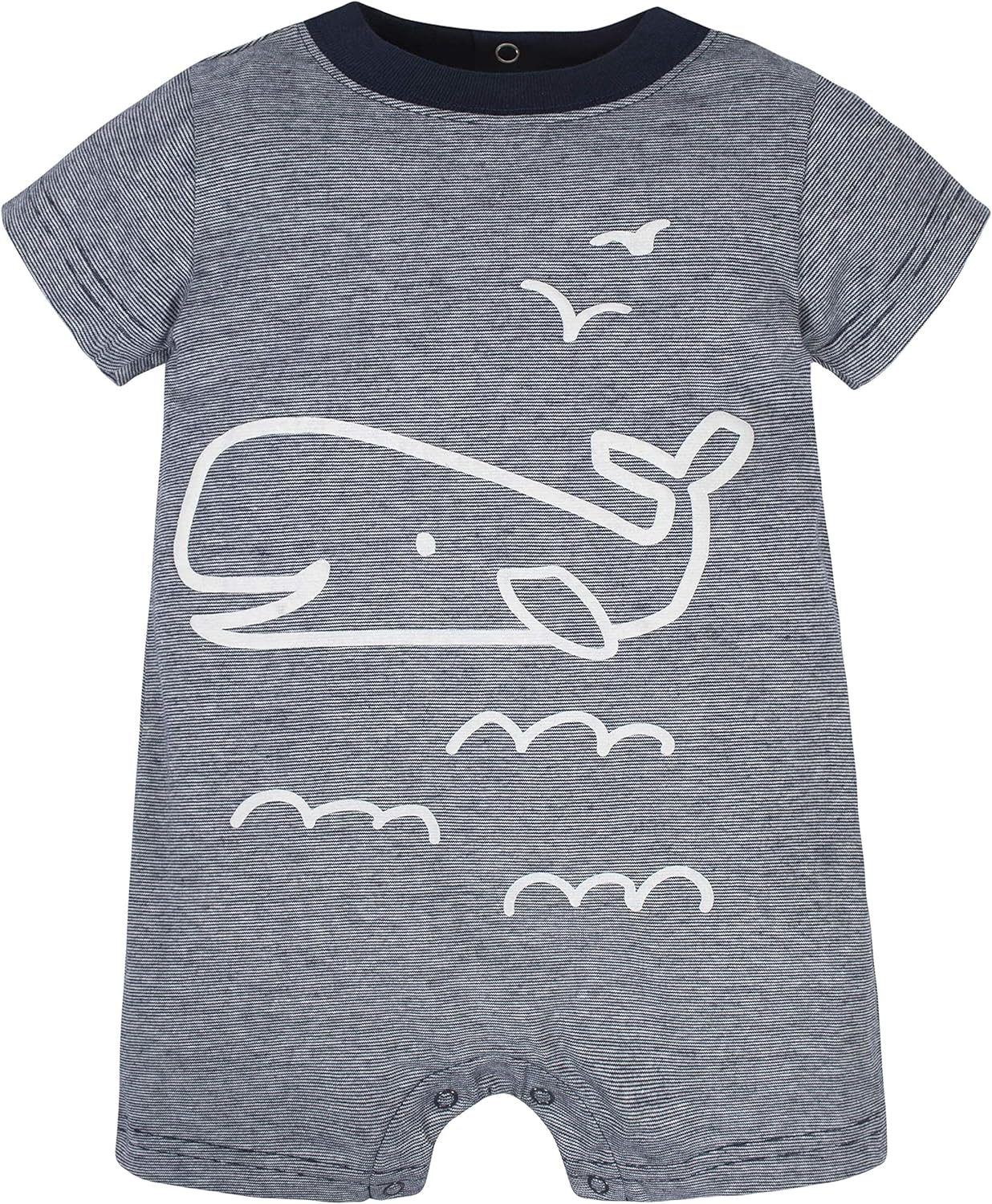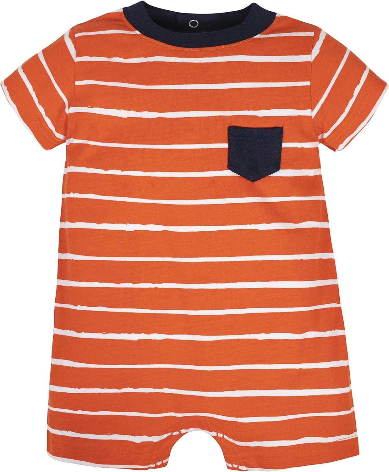 Features comfy crew necks, short sleeves and inner thigh snaps for quick changes