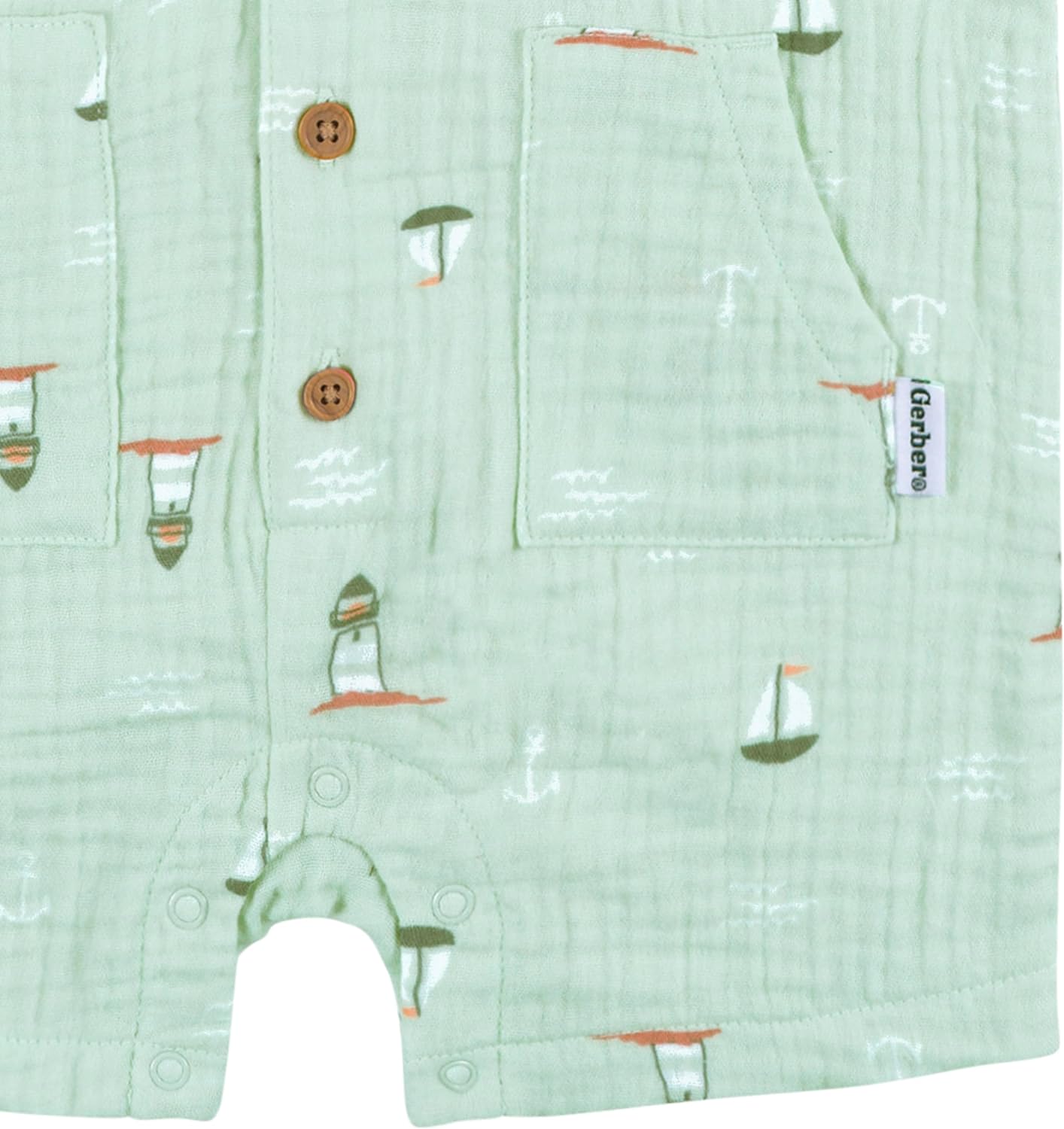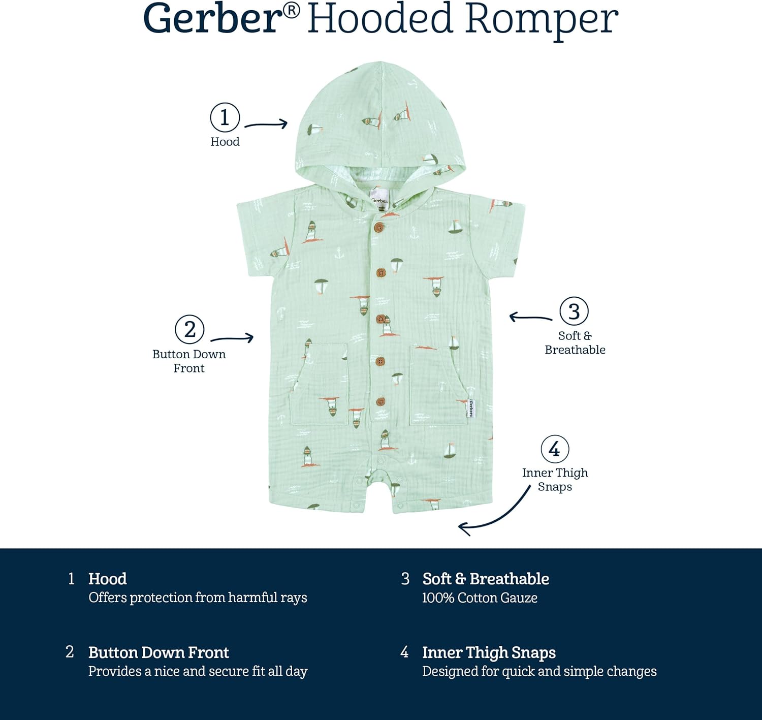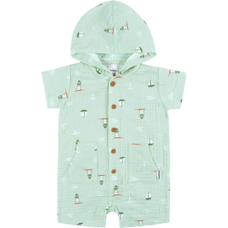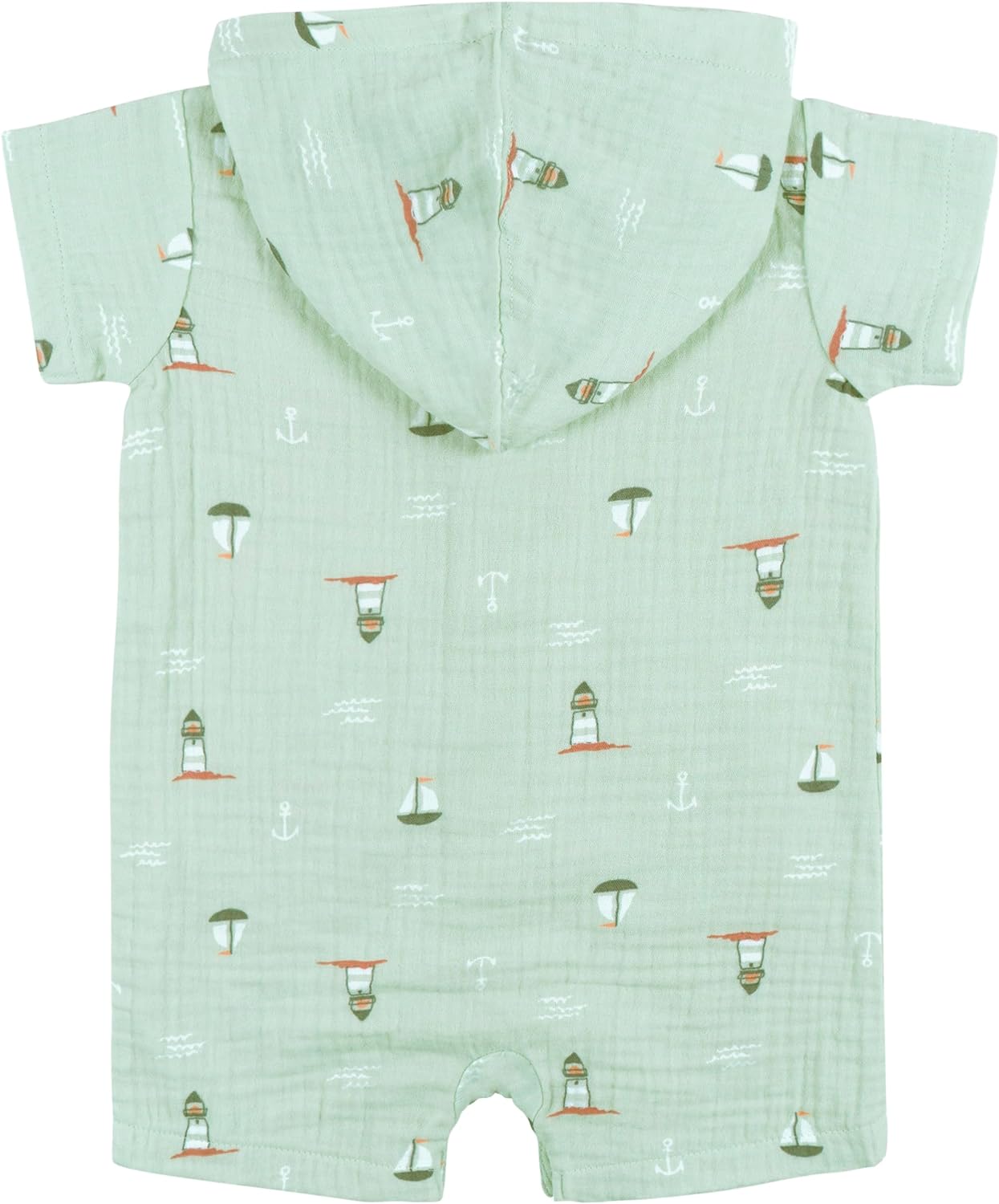 Whether you're taking a family trip to the park, enjoying a day trip, or simply playing in the backyard, our baby boy romper is the ideal choice for any warm-weather occasion. Made from a lightweight, breathable 100% cotton gauze, this baby boy romper keeps your little one cool and happy even in warm weather. Convenient leg snaps make dressing and diaper changes easy, while the button-down front enables a secure fit. And to protect your little one from harmful rays, an integrated hood provides gentle protection. Simple machine cleaning makes it easy to keep this baby boy romper ready to wear all season long! Easy-to-change features, safety features, and super soft fabrics, we offer baby girl clothes and baby boy clothes that are sure to fit any family’s needs. If you’re looking for baby sleepwear, we offer a wide range of baby pajamas, baby PJs, baby footies, baby sleepers, and baby fleece pajamas. We also offer baby socks and baby shoes. Our baby girl shoes are sure to add a special flair to her favorite baby outfits. We also offer many baby accessories that your little one will need, such baby sun hat, baby caps, baby hats, baby mittens, no scratch mittens, baby headbands, and baby girl headbands. Our baby bodysuits or baby Onesies® Brand bodysuits make excellent baby shower gifts, but we also offer baby gift sets. If you like to dress your baby with separates, be sure to check out our baby pants, baby shorts, baby shirts, baby tops, and baby bottoms. Our baby swimwear and baby swimsuits are a big hit too! If it’s bedding you’re looking for, we have crib sheets, changing pad, crib mobile, baby toys, baby blankets, baby gifts, swaddle blanket, and mattress protector. Our baby clothing sizing ranges from baby girl clothes preemie, baby boy clothes preemie, baby girl clothes newborn, baby boy clothes newborn, baby girl clothes 0-3 months, baby boy clothes 0-3 months, baby girl clothes 3-6 months, baby boy clothes 3-6 months, baby girl clothes 6-9 months, baby boy clothes 6-9 months, baby girl clothes 12 months, baby boy clothes 12 months, baby girl clothes 18 months, baby boy clothes 18 months, baby girl clothes 24 months, baby boy clothes 24 months, toddler girl clothes 2T, toddler boy clothes 2T, toddler girl clothes 3T, toddler boy clothes 3T, toddler girl clothes 4T, toddler boy clothes 4T, toddler girl clothes 5T, toddler boy clothes 5T. We have all your baby stuff covered, whether it’s baby boy stuff or baby girl stuff!