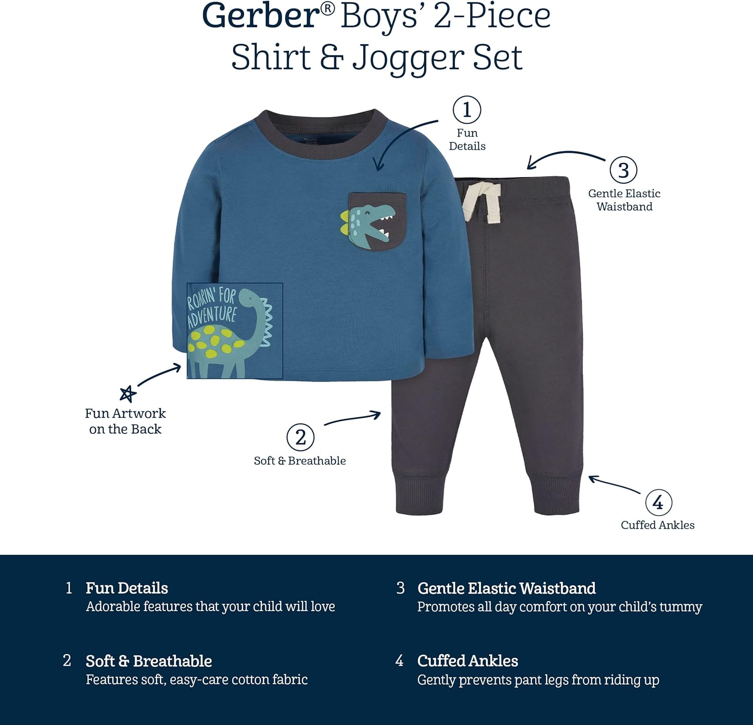 Gerber baby-boys Toddler 2-piece Long Sleeve Tee & Pull-on Jogger Set(Blue Dinos)