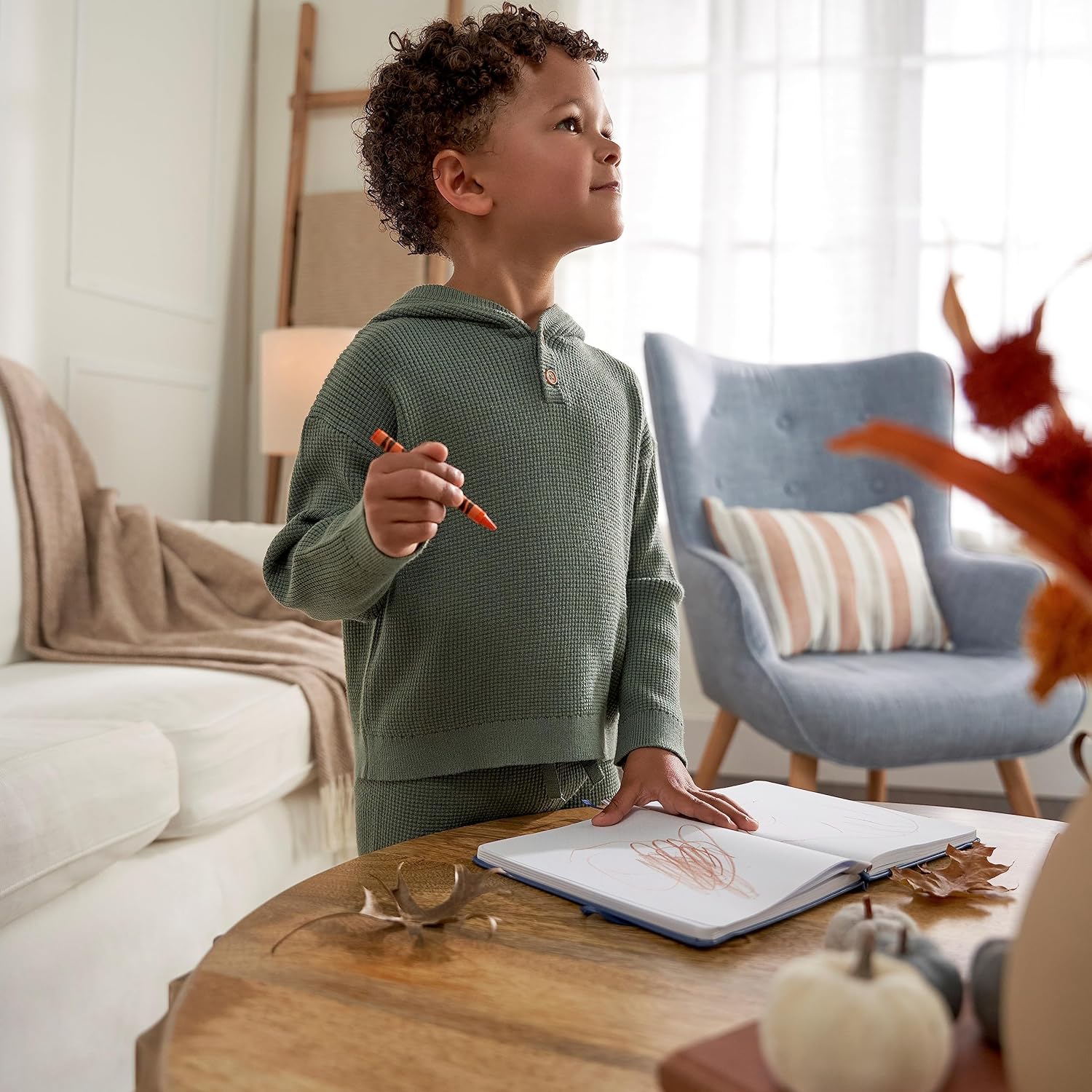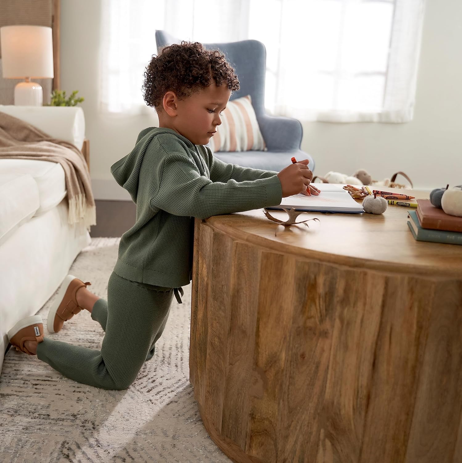 Keep your baby or toddler boy cozy and stylish in cool weather with this solid blue two-piece sweater knit set. Made from a super soft and comfy fabric with a cozy hoodie for extra warmth and comfort-stretch at the neck, wrists, waist, and ankles. Ideal for toddlers learning to dress themselves with an easy on-off design, the relaxed fit keeps them comfortable all day. The pullover top has two buttons enabling a loose or extra-cozy fit, and the pullup pants feature a stretchy waistband for maximum comfort. Faux wood buttons and a faux drawstring add an extra touch of style. This sweater knit set includes one top and one bottom.