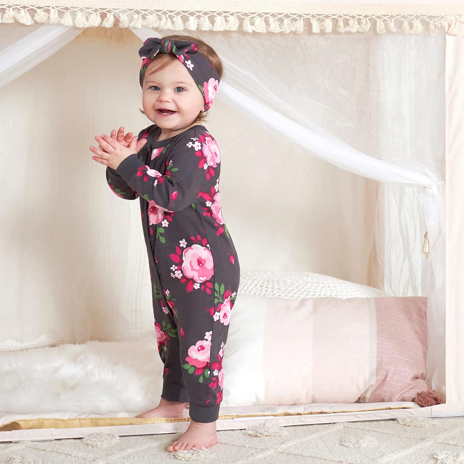 Gerber baby-girls 2-piece Boutique Coverall & Headband Set(Gray Rose)