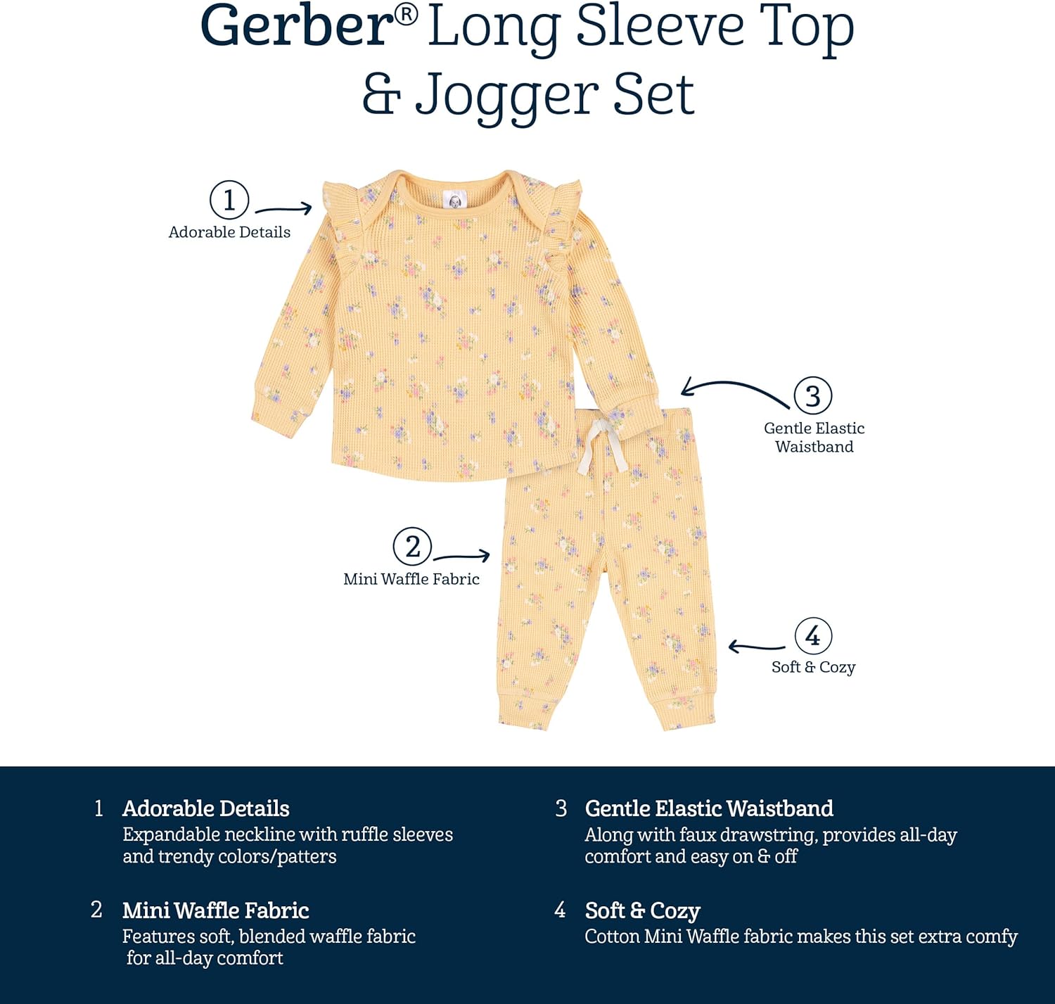 Gerber® extremely soft cotton/polyester long sleeve top and jogger pant sets are perfect for all day wear. High-quality, lightweight, breathable, durable mini waffle fabric with the perfect amount of stretch for active babies and toddlers. We had our essentials independently certified with STANDARD 100 by OEKO-TEX® so that you don’t have to worry about harmful substances in your baby’s wardrobe. Gerber quality, comfort, safety and value never goes out of style. Includes one lap shoulder long sleeve top and one jogger pant.