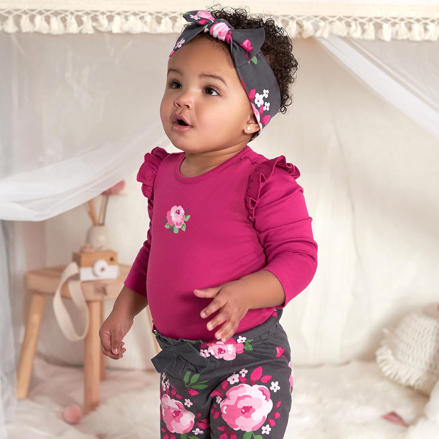 Gerber baby-girls 3-piece Long Sleeve Onesies Bodysuit, Pants & Headband Set(Gray Rose)