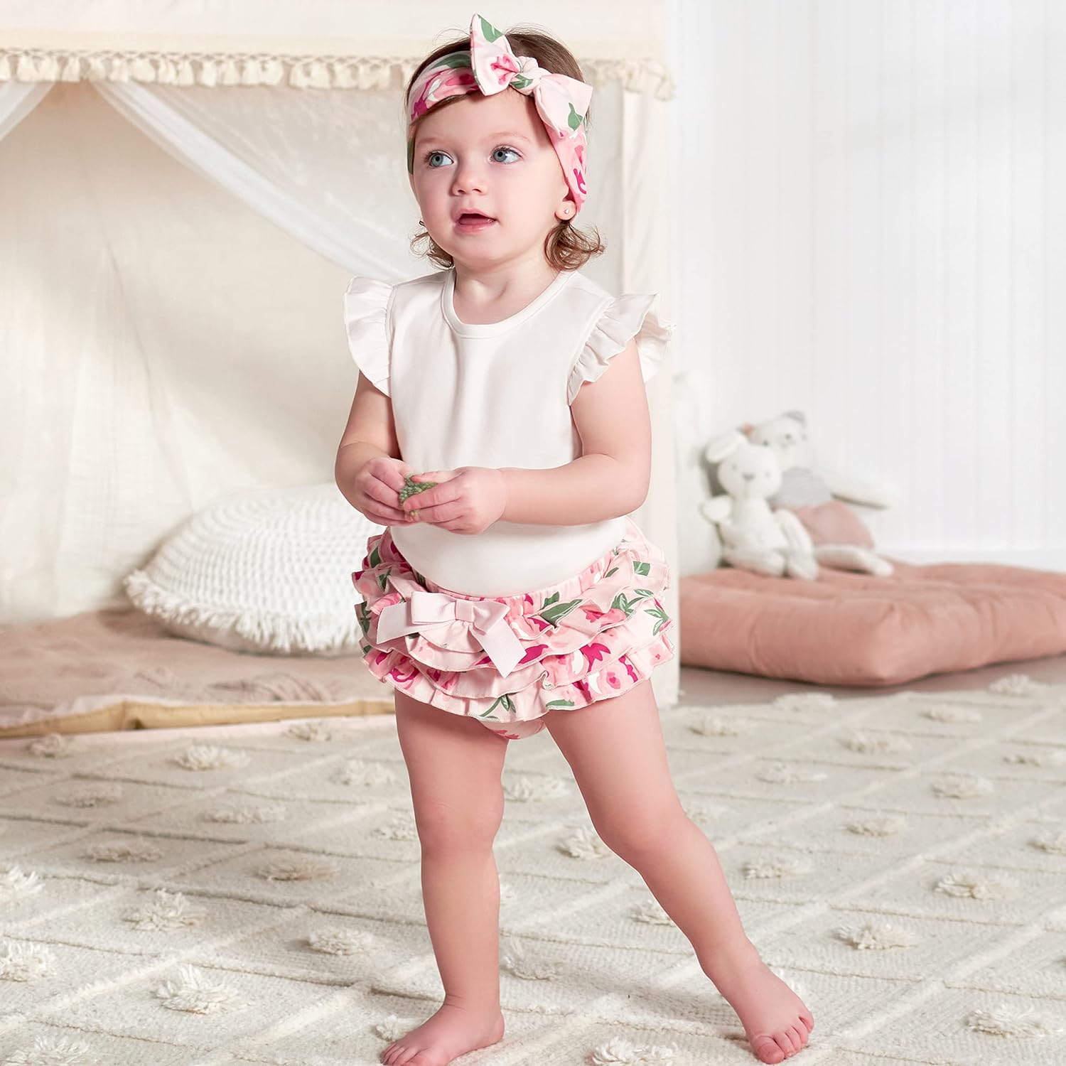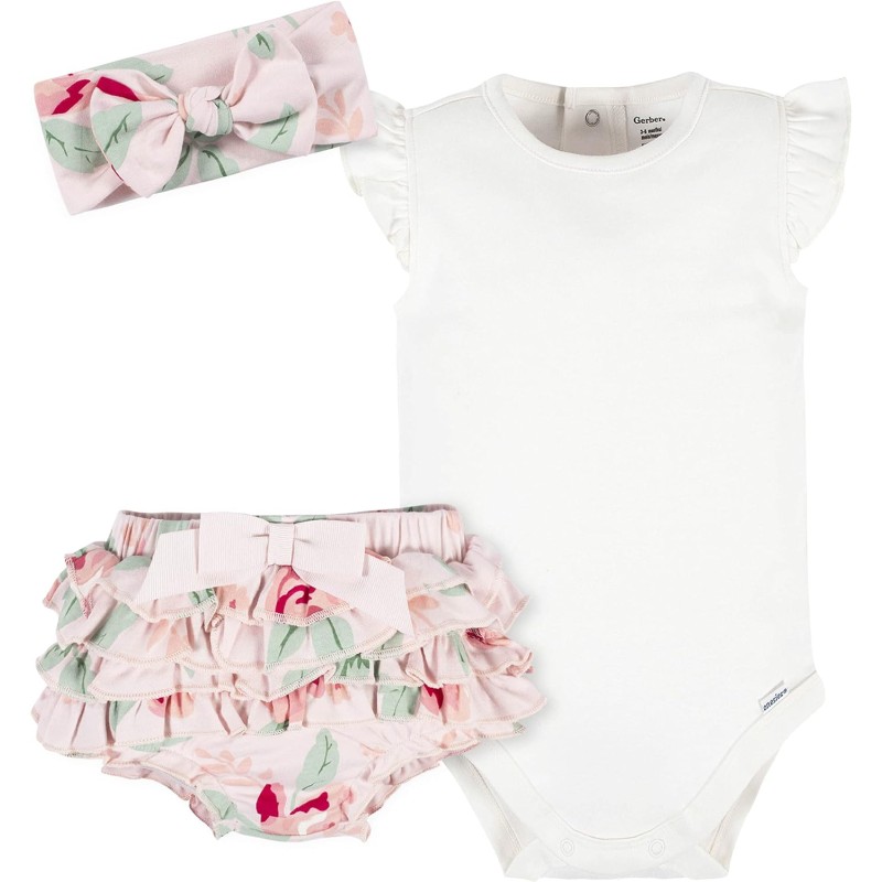 Gerber baby-girls 3-piece Short Sleeve Onesies, Diaper Cover & Headband Set(Pink Rose)