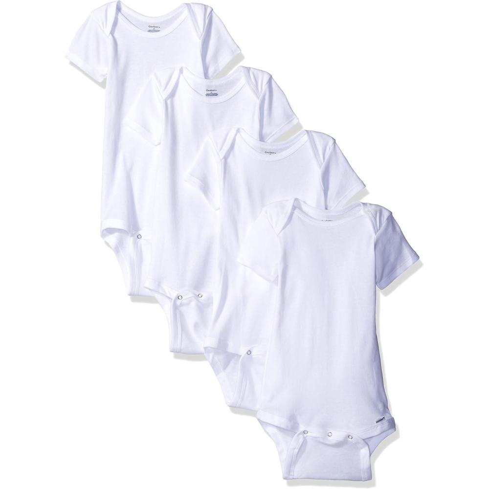 Gerber onesie brand one piece underwear are an essential in baby's wardrobe, great for coordinating with your favorite pants and Gerber accessories to create the perfect outfit for baby, these are made of 100 percent cotton for comfort and softness, have a lap shoulder neckline for ease of dressing, hems are double stitched to keep smooth after excessive washings and a snap closure conveniently positioned for ease of changing baby's diaper, 4 pack assortment includes allover prints and solids with embroidery, available in sizes 12, 18 and 24 months, machine wash and dry, essential for every new mom and great for gift giving
