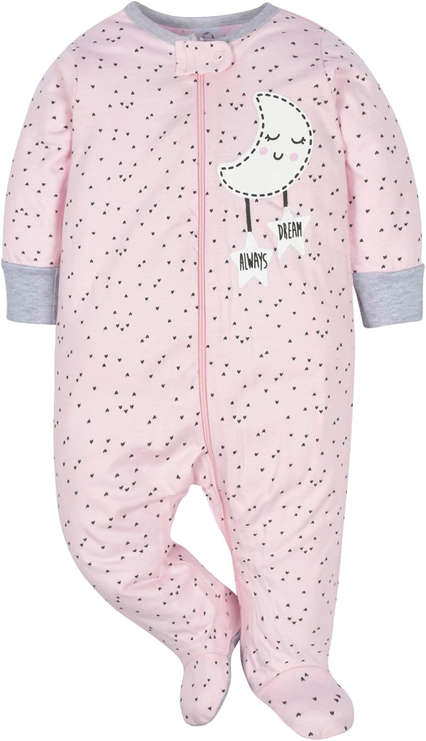 Gerber Sleep ‘n Plays are the ultimate footie pajamas baby is sure to love! These soft footies are made with 100% cotton, a comfortable fabric that’s perfectly breathable to prevent irritation against baby’s delicate skin. They’re appropriate to use as newborn footie pajamas as they’re made to comply with all safe sleep standards. They’re also available in sizes all the way up to 6-9M to fit older or larger babies. Each Gerber Sleep n’ Play features a zipper down the front of the outfit to allow for easy and fast diaper changes. This zipper makes the baby sleeper incredibly easy to put on as well as to take off. Atop the zipper is a safety tab with a snap to keep the zipper held in place. This reduces irritation caused by baby’s chin being poked by the zipper. These baby sleepers are footed to add extra warmth which is wonderful for sleepy time as well as if there is a chill in the air. It also means no fooling around with baby socks! These footie pajamas kids will love to wear to bed because of their supreme comfort as well as cute and fun patterns. Available in assorted colors and patterns, they’re suitable baby girl sleepers as well as baby boy sleepers. Babies love the comfortable feel and parents love how cute they look! But these Sleep n’ Plays aren’t just for sleep! They’re wonderful comforatble, casual outfits to wear during the day. They allow babies mobility and provide warmth. They’re perfect for play but are cute enough to be worn out on the town! These outfits are perfect to wear on a stroll outside, to the grocery store, to day-care, or to grandma and grandpa’s house! The possibilities are endless! The versatility of these outfits truly gives them a spectacular value that all parents will appreciate. They make an excellent gift for any baby boy or baby girl you know and love! Gerber provides high-quality products that are easy and convenient for parents as well as cute and comfortable for baby. Gerber provides safe products that parents can trust.