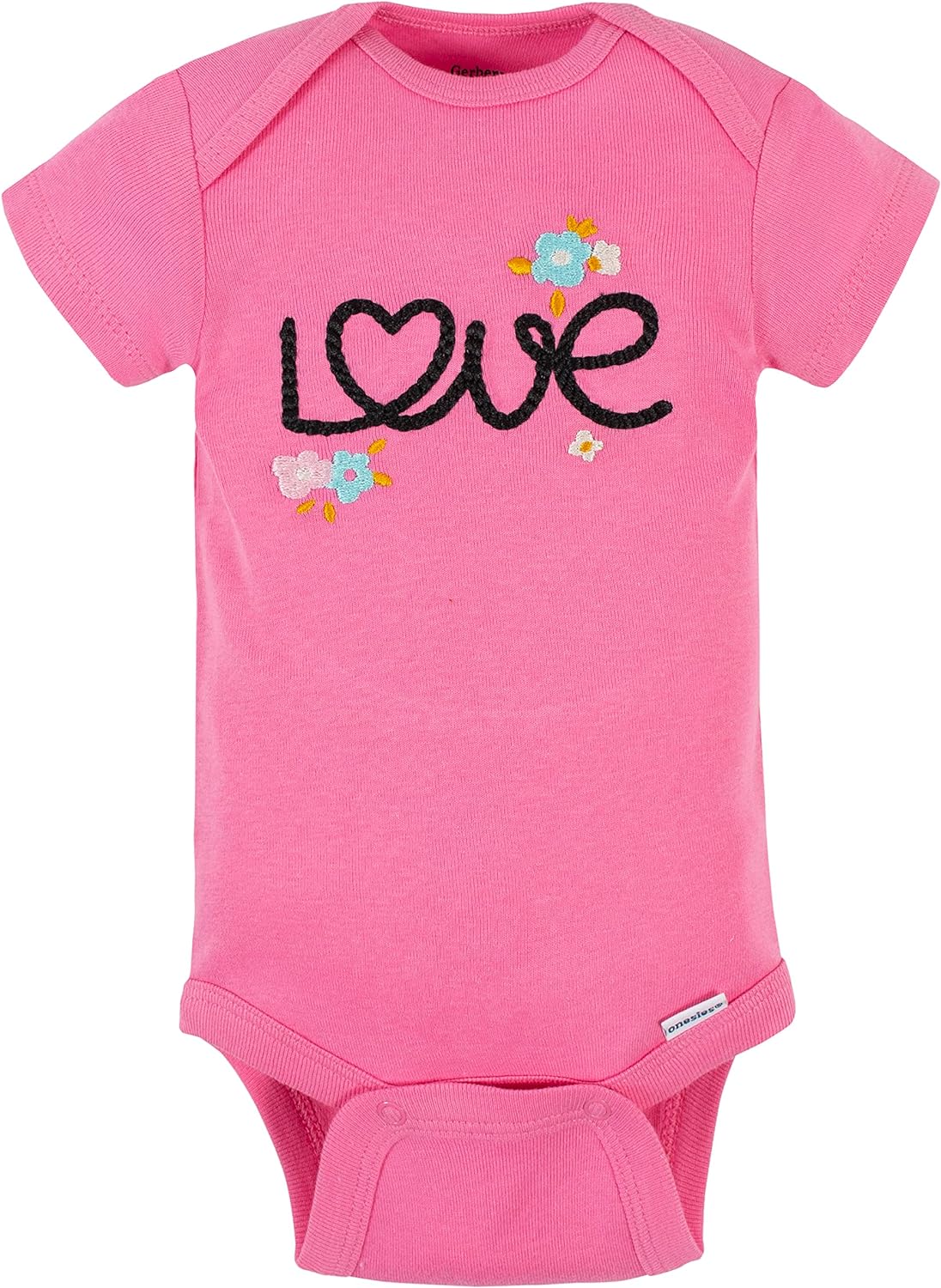 Your little girl will start the day looking her best dressed in one of these Gerber Onesies brand short sleeve bodysuits! Moms and dads will appreciate the higher-in-the-front bottom nickel-free snaps closure that makes for fast and easy diaper changes. 100% cotton rib for breathability and comfort. Mix and match with your favorite bottoms to create a complete look. An essential item for new parents, great for gift giving.