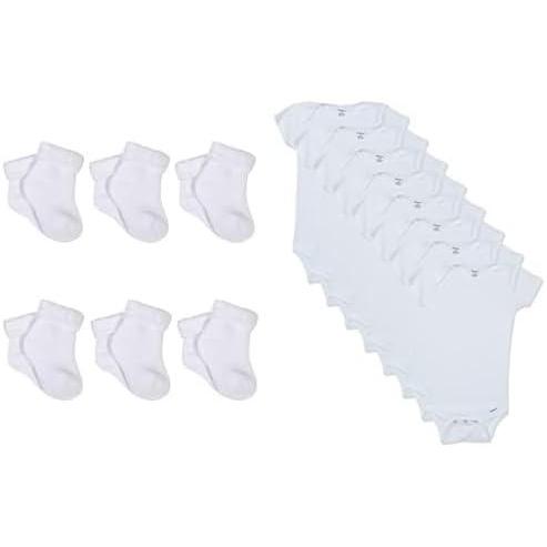 This Gerber baby girls' 6-pair short sleeve bodysuit is made of a poly terry, nylon, spandex blend that provides breathability and comfort. The snap closure at the bottom allows for easy changing. It can be machine washed and dried. This infant onesie has a solid white color and is recommended for use as a newborn. The Gerber brand sock has no quotes or special characters.