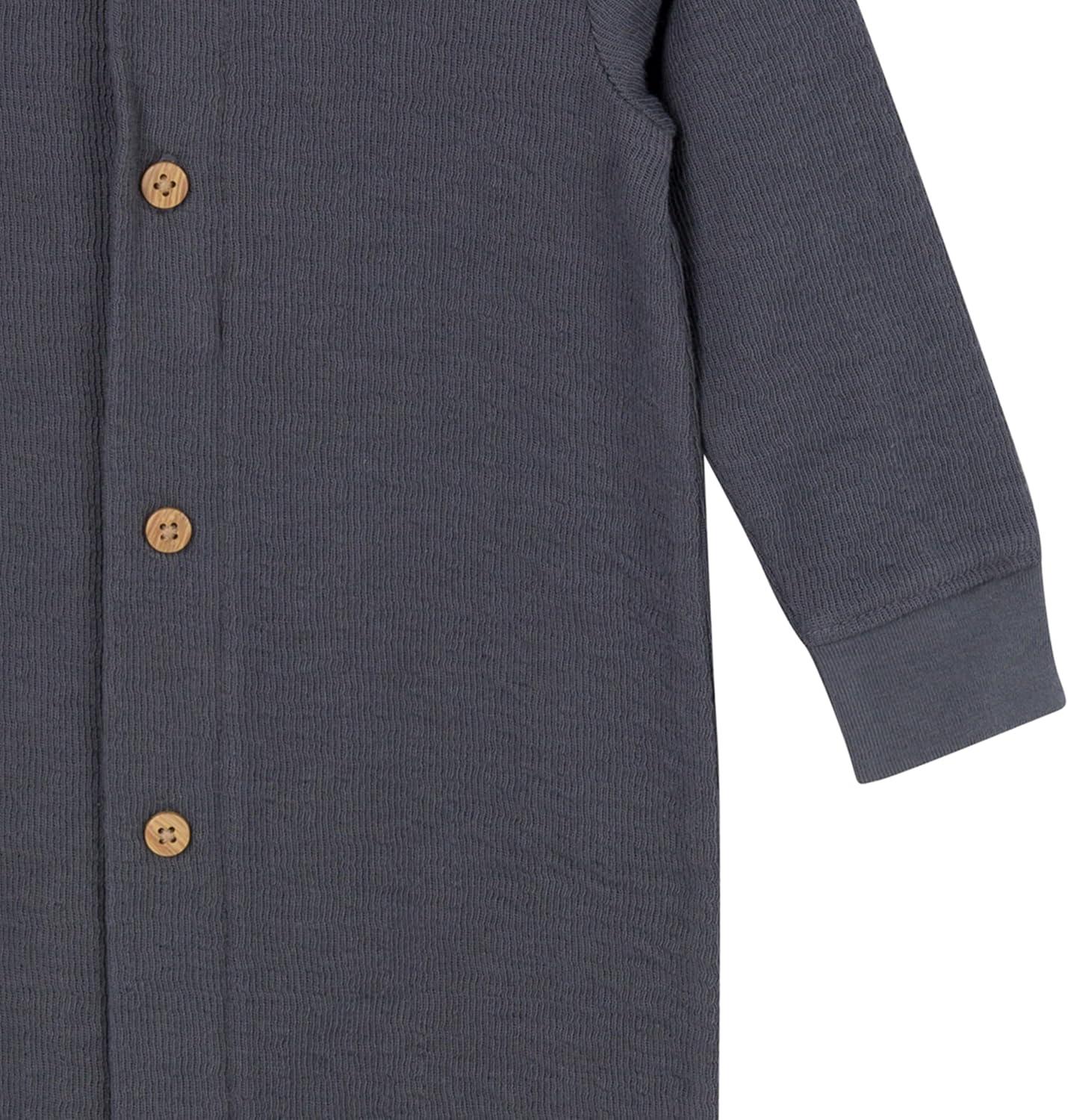 Our hooded infant and baby romper is crafted from cotton with spandex at the wrists and ankles to provide a soft feel and comfortable stretch that moves with your active little one. The top two buttons open to make dressing easy, while convenient leg snaps ensure hassle-free diaper changes. With a cozy hood, it's the perfect snuggle companion for chilly days, keeping your baby warm and stylish while at home, play, or out running errands. Keep it clean and ready to go all season long with machine cleaning so your little one can enjoy it again and again.