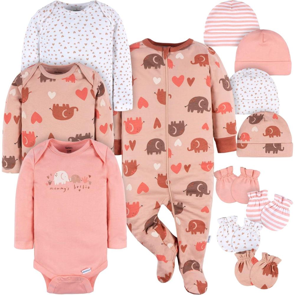 Your baby will look adorable and feel comfortable in this charming and stylish clothing set. It includes three Onesies Brand Bodysuits with convenient snaps for easy diaper changes and lap shoulder neckline for easy fuss-free changing and dressing. The Sleep N' Play features an inverted zipper protector to prevent accidental pinches. With four cotton caps and four mittens, your little one will stay warm and cozy. All items are made from soft, machine washable cotton for convenient easy care and maintenance. This set is perfect for new parents and makes a great gift for a baby shower.