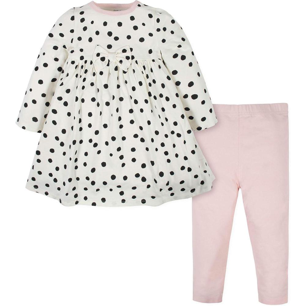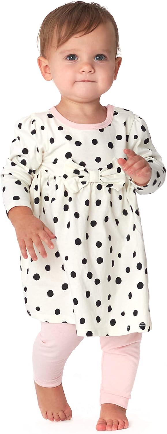 Our 2-piece dress set makes us want to twirl with delight! This baby and toddler girl 2-piece outfit is made with soft cotton jersey, a breathable fabric that will give your baby all-day comfort. Our baby girl outfit includes one long sleeve dress and one pair of pants. The dress features a shoulder placket to make changing as simple as possible. No more fussing baby when you pull a shirt over her head! The baby pants have a gentle elastic waistband so putting them on and taking them off is super easy. Plus, they’re super comfy on your baby’s sweet tummy. This baby girl outfit is the perfect playtime outfit when it’s cool outside but is great to be worn out on the town as well. You just can’t beat its supreme comfort and adorable style. Give this 2-piece set as a thoughtful and practical gift today. Each piece in this set is machine washable and machine dryable. Dress: 100% cotton jersey / Pants: 95% cotton 5% spandex