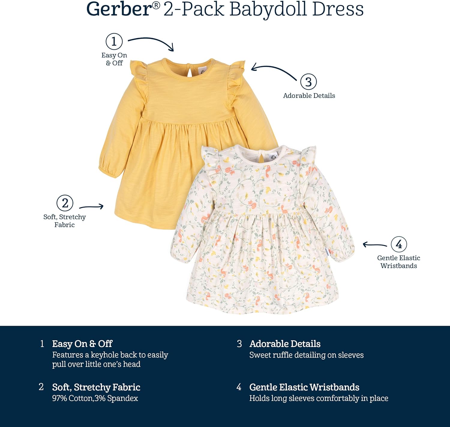 Gerber Baby Girls’ Toddler 2-Pack Long Sleeve Dresses(Vanilla & Green Floral)