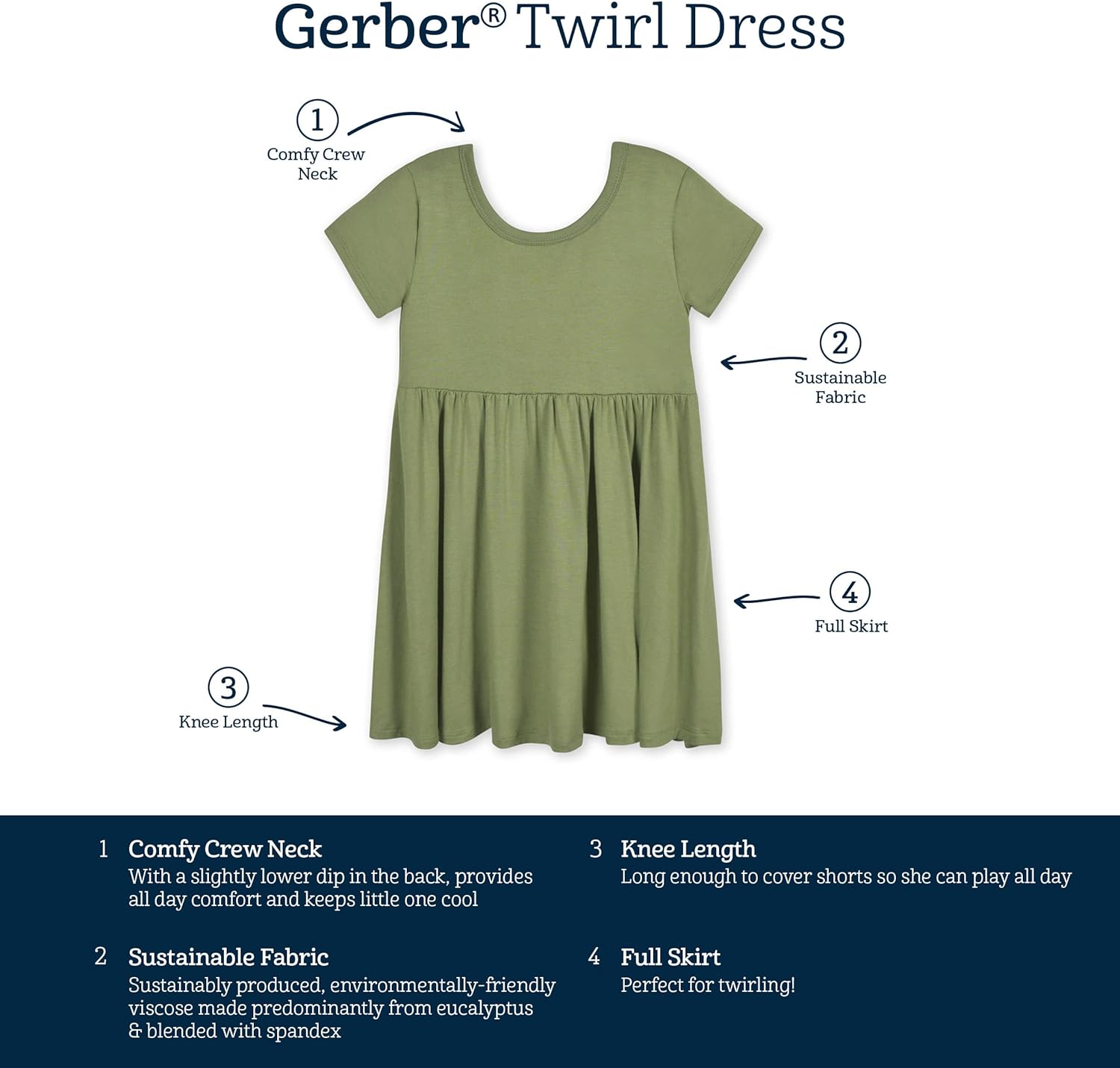 Gerber Baby Girls’ Toddler Buttery Soft Short Sleeve Twirl Dress with Viscose Made from Eucalyptus(Moss)
