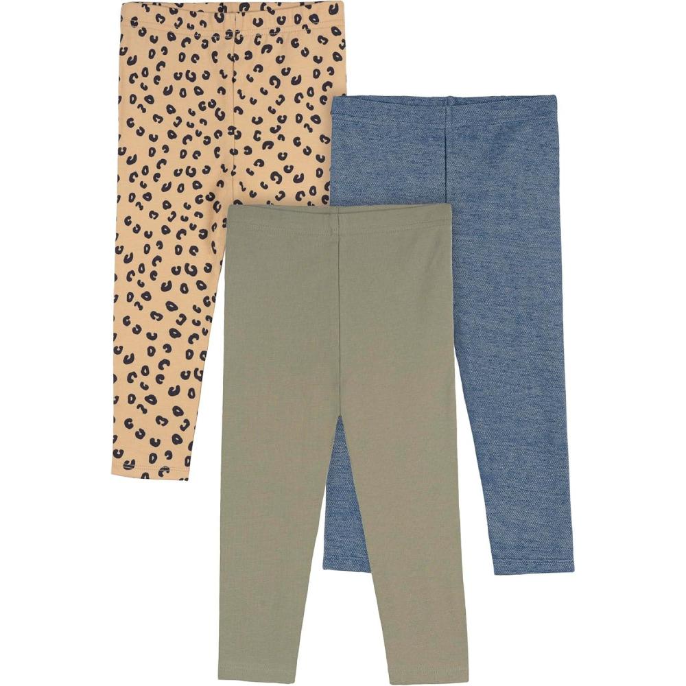 Add modern flair to your little one’s wardrobe with this stylish 3-pack of baby and toddler girl jeggings. Designed for comfort and made to move, this set includes a trendy leopard print, a classic denim wash, and a soft olive green solid—perfect for everyday wear with a fashionable twist. Each pair features jersey knit front and back panels and jegging-style side seams for that denim-inspired look with the stretch and softness of leggings. Whether she's playing, lounging, or heading out with you, these jeggings are a go-to for effortless, all-day comfort.