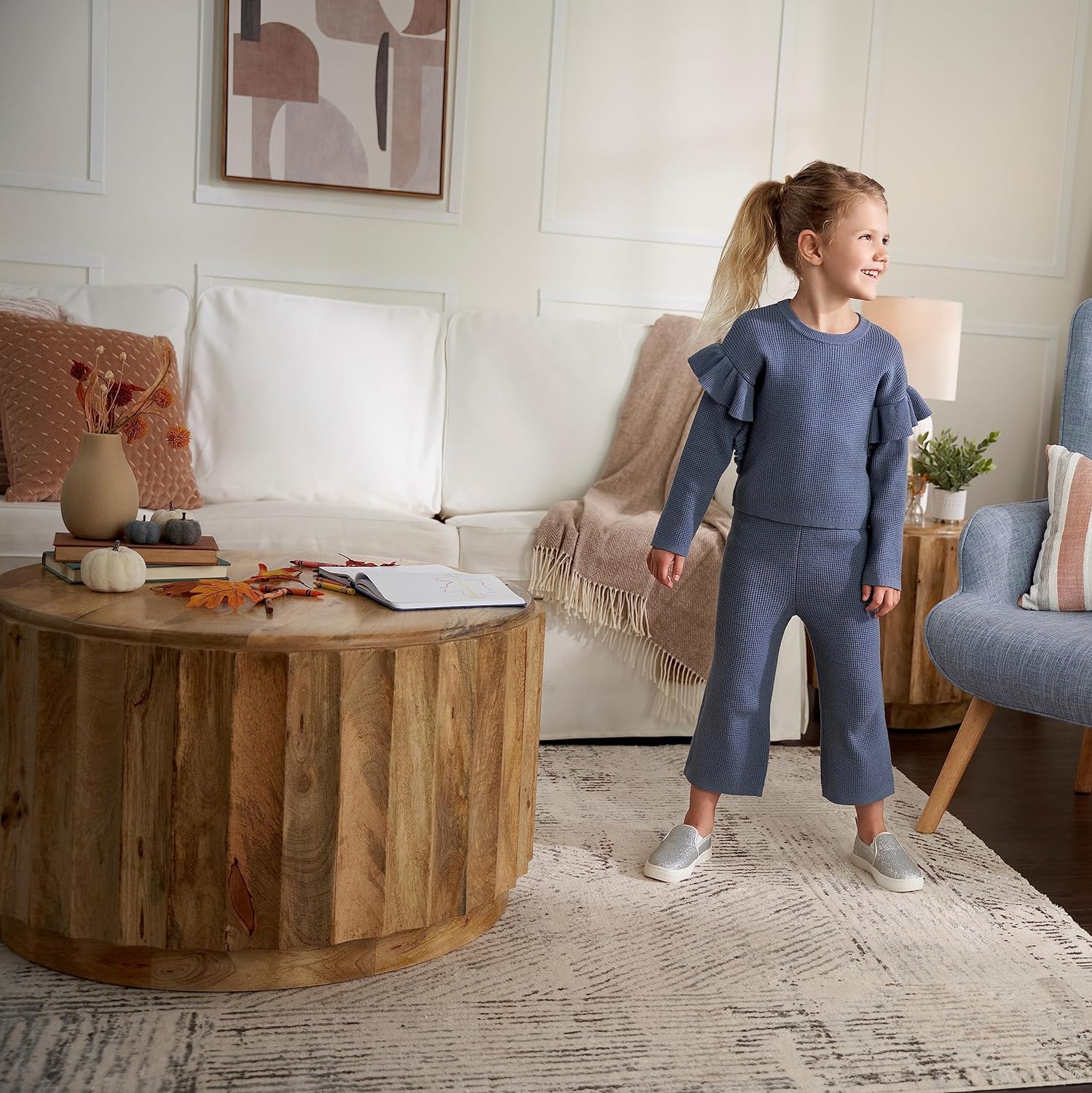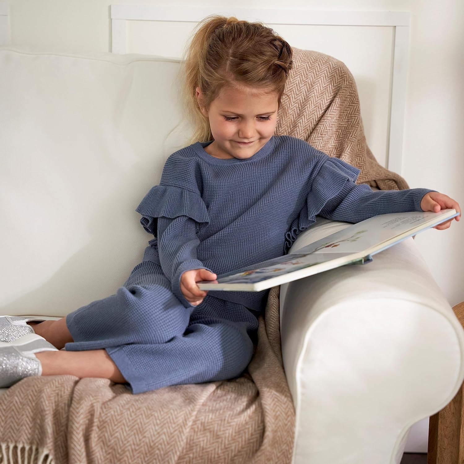 A matching set in solid teal made from a soft and cozy material, this two piece set is perfect for your little girl. The pullover top has a comfort-stretch rib finish at the neck and wrists, while the pullup bottom features a comfort-stretch waistband to provide a perfect fit. The relaxed style and adorable look is secure, but allows for easy movement, making it ideal for everyday wear or family pictures. To add a cute touch, shoulder ruffles extend down the length of the top. This set includes one top and one bottom.