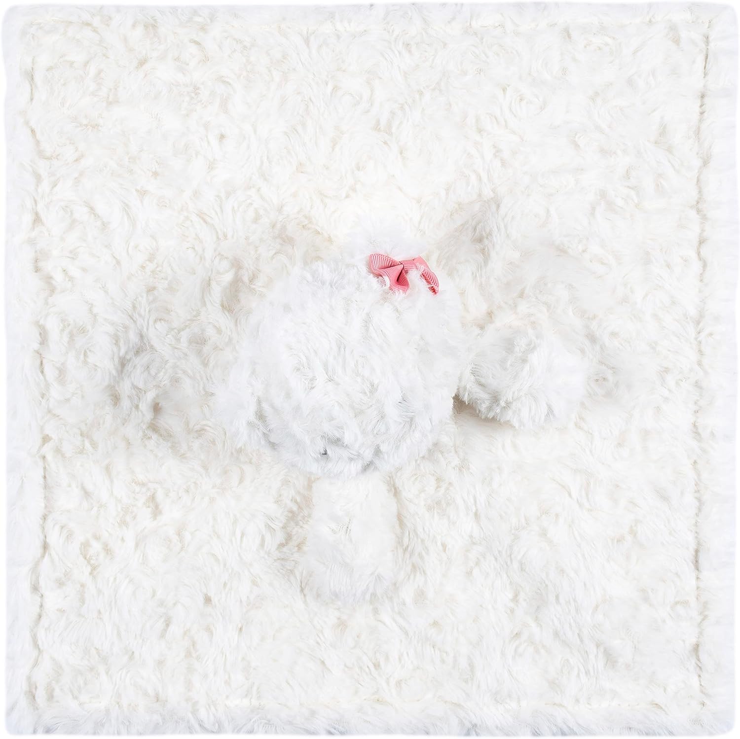 Plush 3″ dog head with a 12″ x 12″ security blanket with a satin backing for soft feel against skin