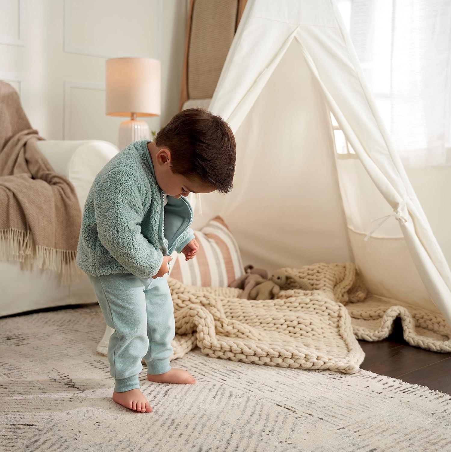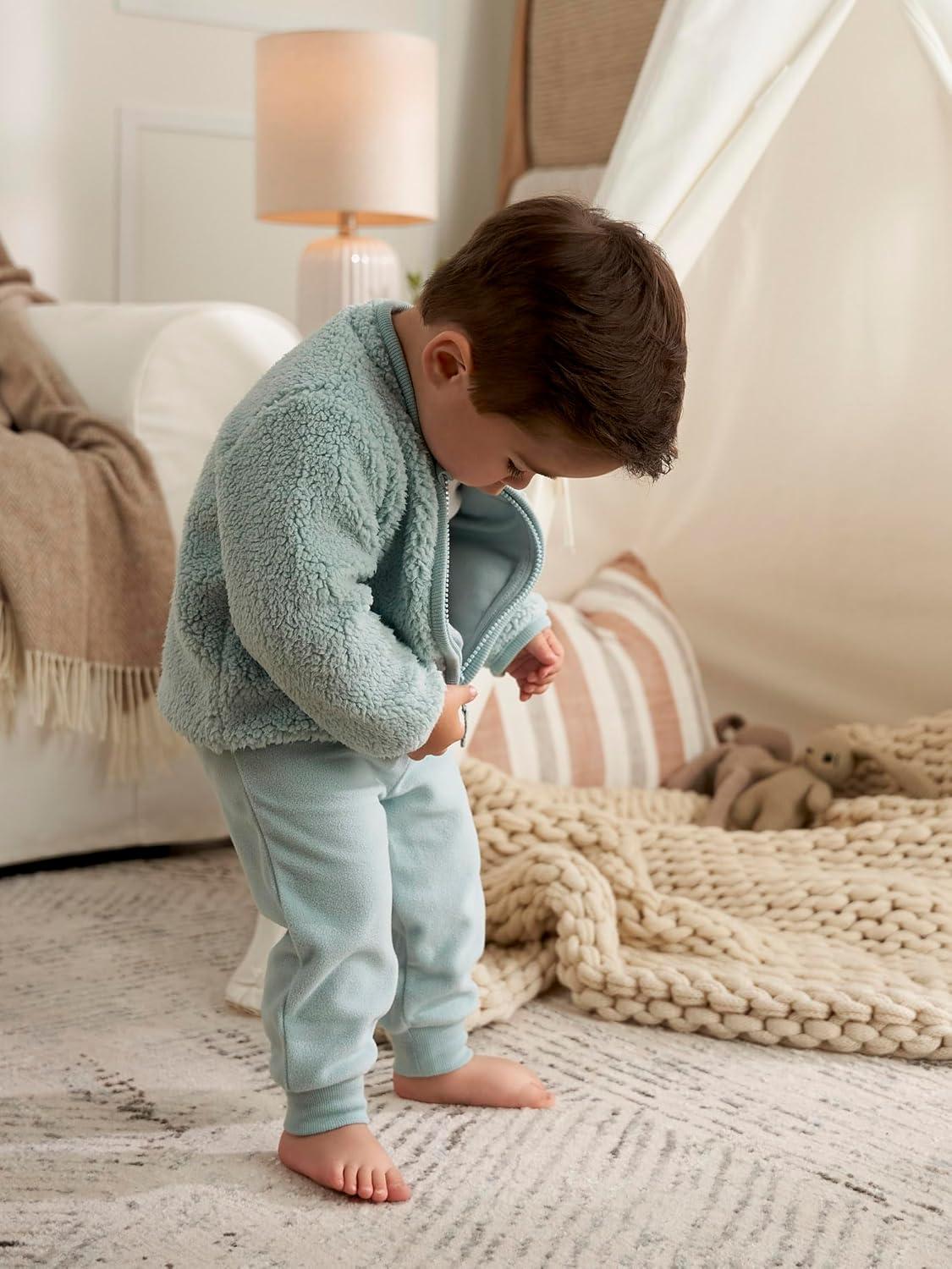 Pullup pants and zip up jacket make getting fast and easy to get fashionably dressed. Incredibly soft jacket and pants make for super soft and comfortable wear wherever you go. Matching Sherpa jacket and pants set perfect for a baby boy or toddler’s boy’s fall or winter wardrobe. Great for running errands, play dates and even a slow day at home. Easy to layer jacket over a shirt to keep your baby boy or toddler boy comfortable all day. Graphic screenprint on pocket. Includes one sherpa jacket with matching jogger pants for your baby or toddler boy. Independently certified with STANDARD 100 by OEKO-TEX® to ensure harmful substances are not present. Jacket is 100% Poly Microplush. Pants are 100% Microfleece. Machine wash and tumble dry.