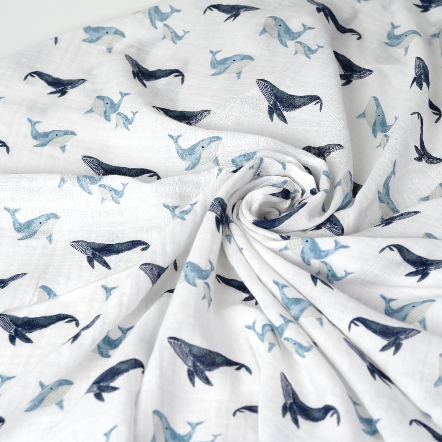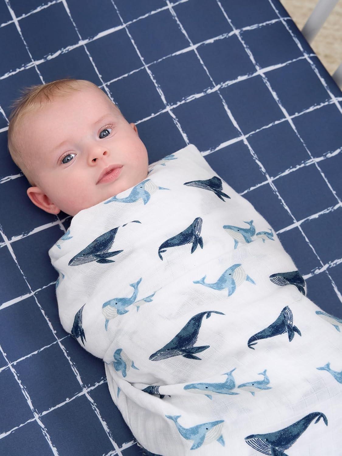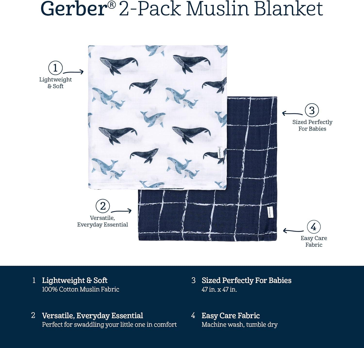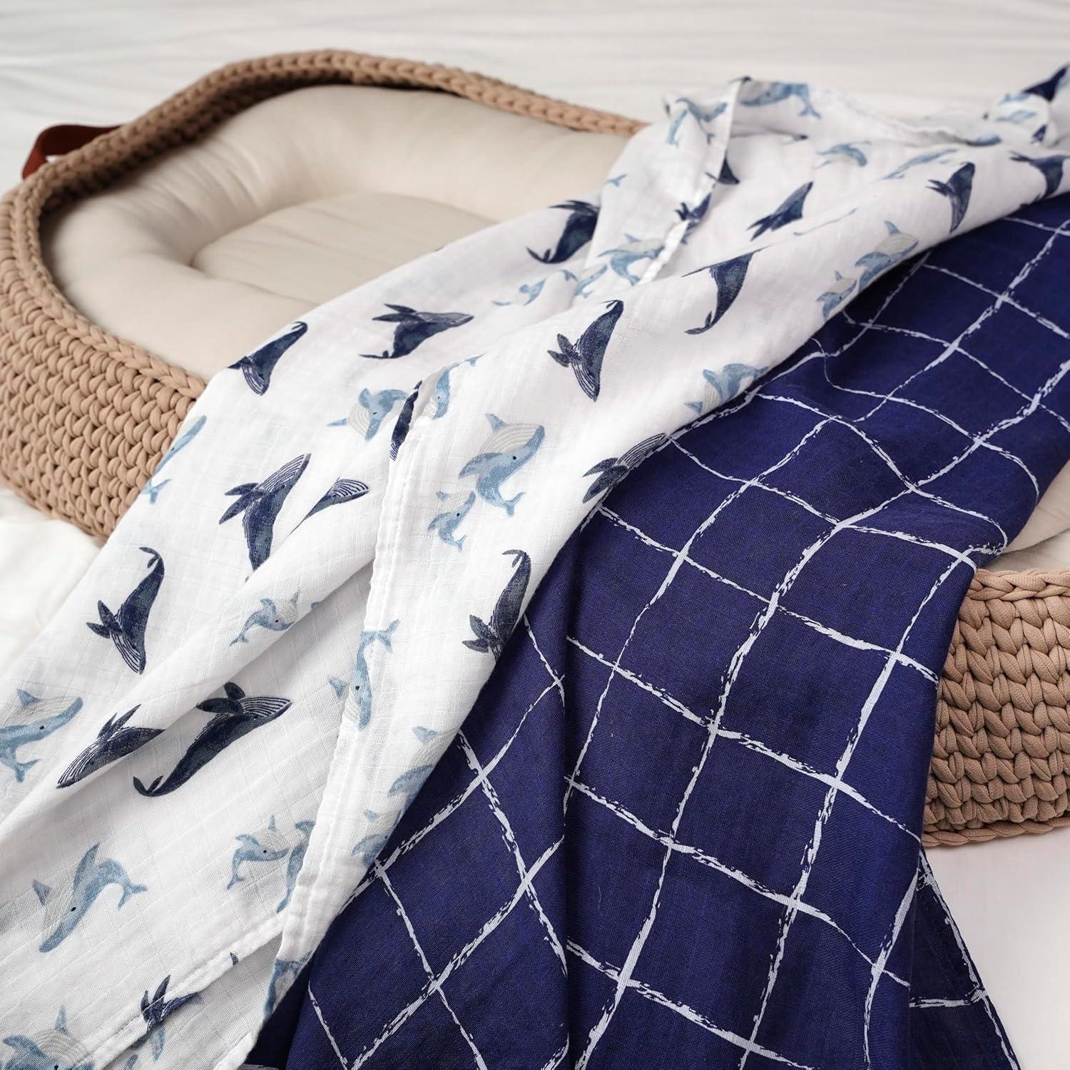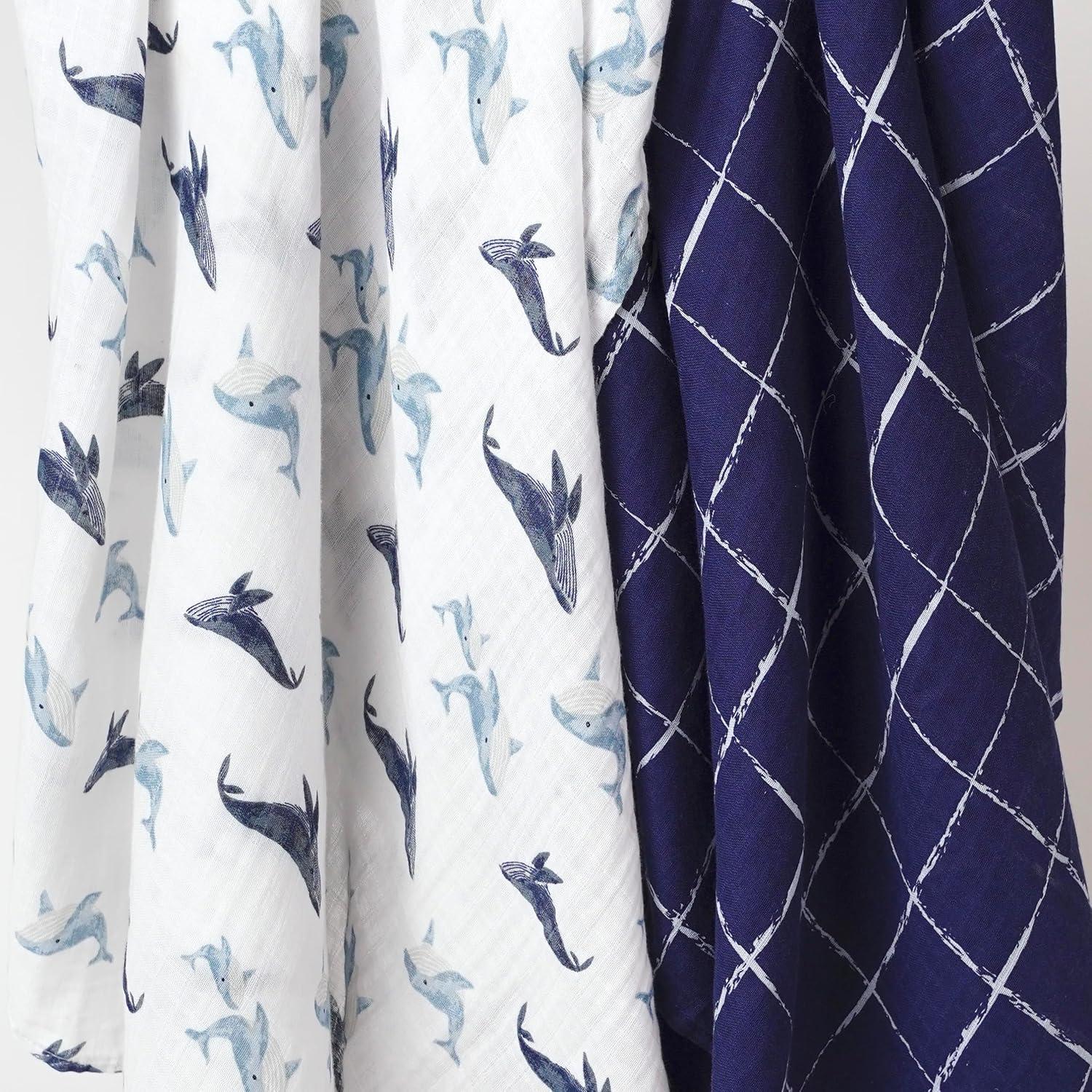 Snuggle your little one in comfort with this 2-pack of muslin baby blankets, designed for softness, breathability, and everyday versatility. Made from 100% cotton, these lightweight swaddle blankets are gentle on baby’s delicate skin and help keep them cozy without overheating—perfect for naps, stroller rides, or tummy time on the floor. Each blanket measures a generous 47″ x 47″, giving you plenty of coverage for swaddling, nursing, or using as a play mat when you're out and about. With a calming blue and white color palette, this set includes two charming designs: one with playful whale illustrations and another in a soothing coastal blue color. These baby blankets are not only adorable, they’re practical too. They’re machine washable and dryer safe, so they’re easy to clean and always ready for your next outing or snuggle session. Whether you're building your own collection of baby essentials or searching for a thoughtful baby shower gift, these muslin blankets deliver comfort, convenience, and a splash of coastal charm. Note: For safety, infants under 12 months should never be left unattended with a blanket.