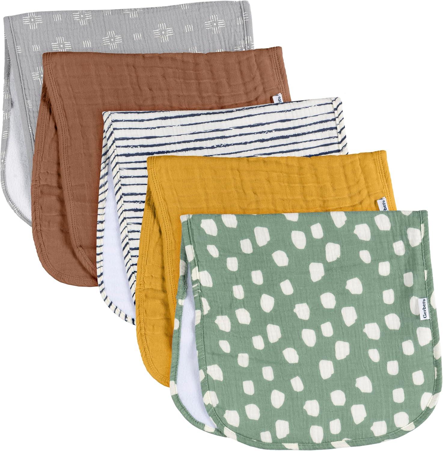 Five prewashed muslin burpcloths with a mix of patterns and prints