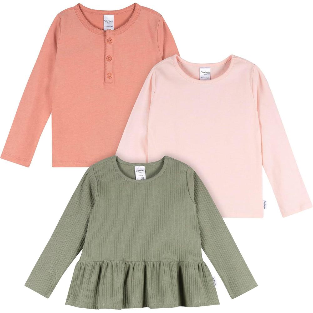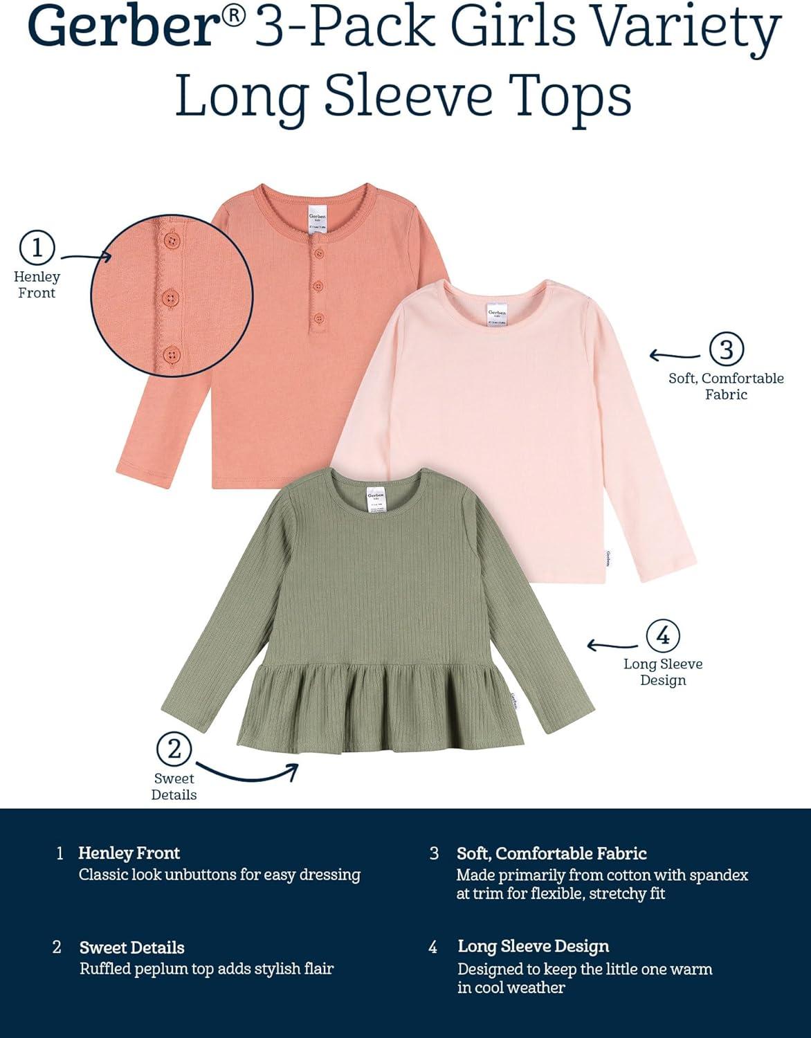 This 3-pack of long-sleeve tops for girls offers the perfect blend of style, comfort, and everyday convenience. Featuring a mix of soft pastels, a bold navy stripe, and playful textures, each top brings something unique to her wardrobe. Made from soft, breathable fabrics, these tops are great for all-day wear, perfect for active play and quiet downtime. Thoughtful details like scalloped hems and Henley-style buttons add an extra touch of charm to every outfit.