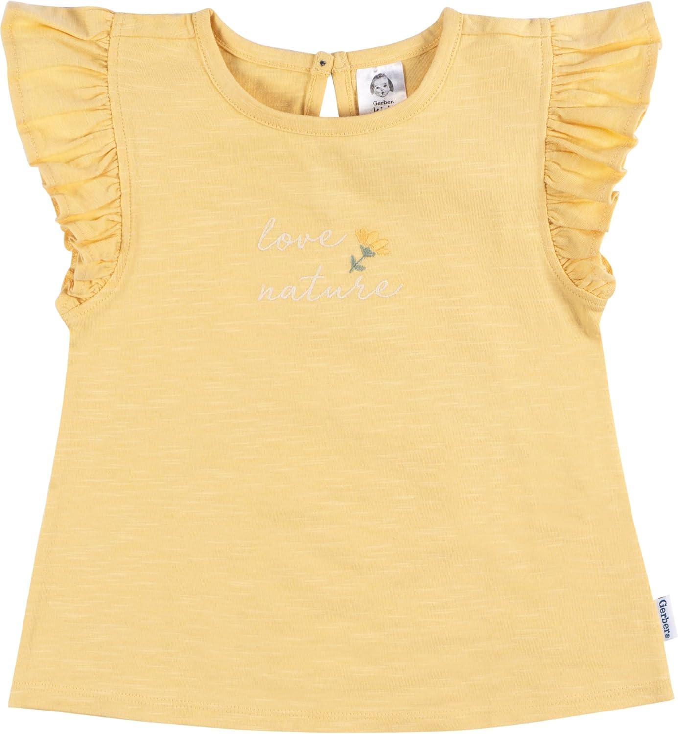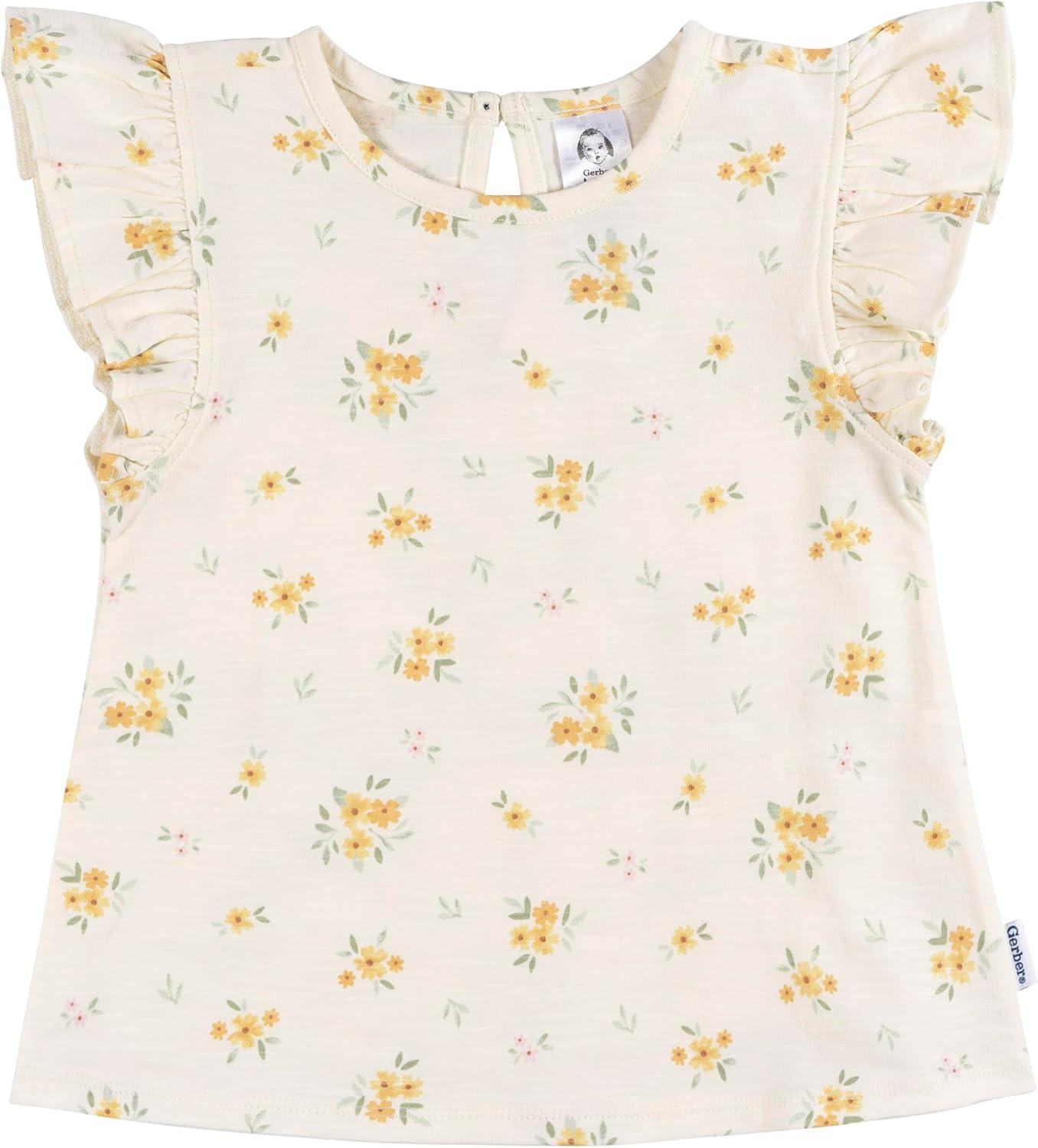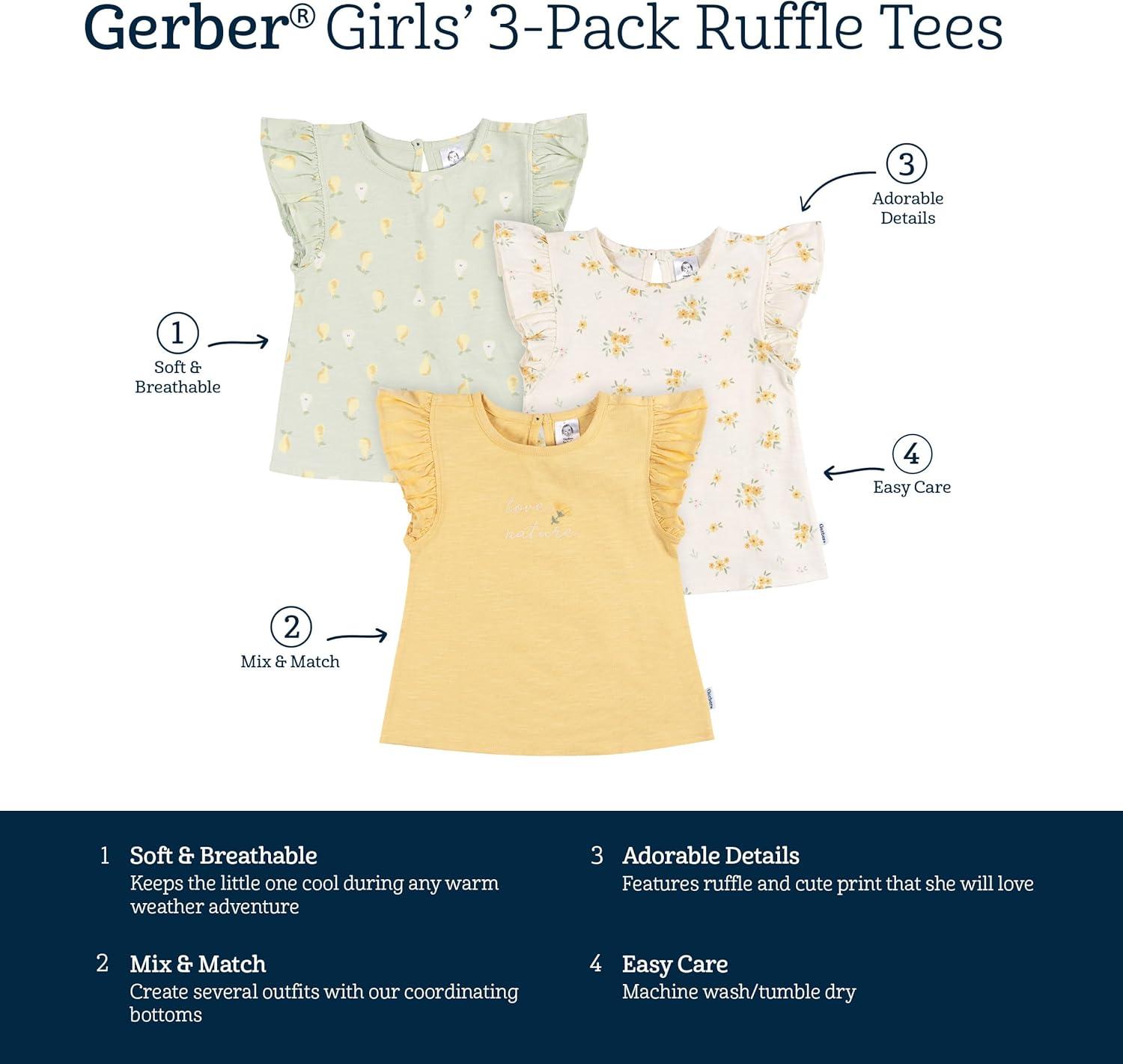 Prepare for the sunny days ahead by refreshing your little one's wardrobe! This trio of T-shirts for baby girls or toddler girls is the ideal pick for warm-weather adventures. Crafted from 100% cotton, these shirts are soft on sensitive skin and made for a breathable fit. Your child will love in wearing our T-shirts wherever the day takes them. The assortment of prints and colors in the pack makes it easy to put together a variety of coordinating outfits. With the stylish addition of shoulder ruffles, this comfy everyday option will quickly become a favorite for your child. And to keep things simple, each T-shirt is machine washable, ensuring they all stay clean and ready for wear throughout season.