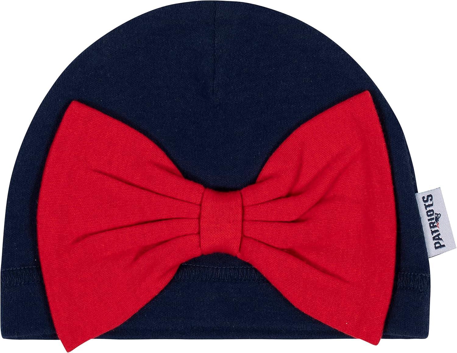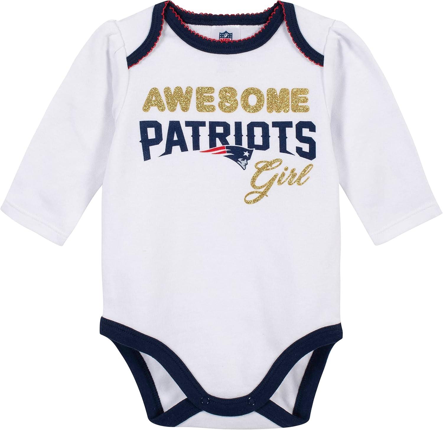 Get the whole family ready for the big game! This officially licensed NFL 3-piece set is the perfect first outfit for your little one! Your baby will stay comfy throughout the entire game (and day!) in the cotton/poly interlock fabric of this NFL baby bodysuit. The bodysuit features an expandable lap shoulder neckline to keep changes comfortable and quick. The bodysuit also features a screen print team logo with glitter front and center to show off baby’s team pride. The bottom snaps are positioned for convenient diaper changes, so taking breaks from the game won’t last long. The baby pants feature a gentle elastic waistband, and the cap features a soft cuff and adorable bow. This baby girls’ bodysuit is a perfect choice for those cool game days. This outfits includes one long sleeve bodysuit, one footed pant, and one cap. This outfit is machine washable for your convenience.