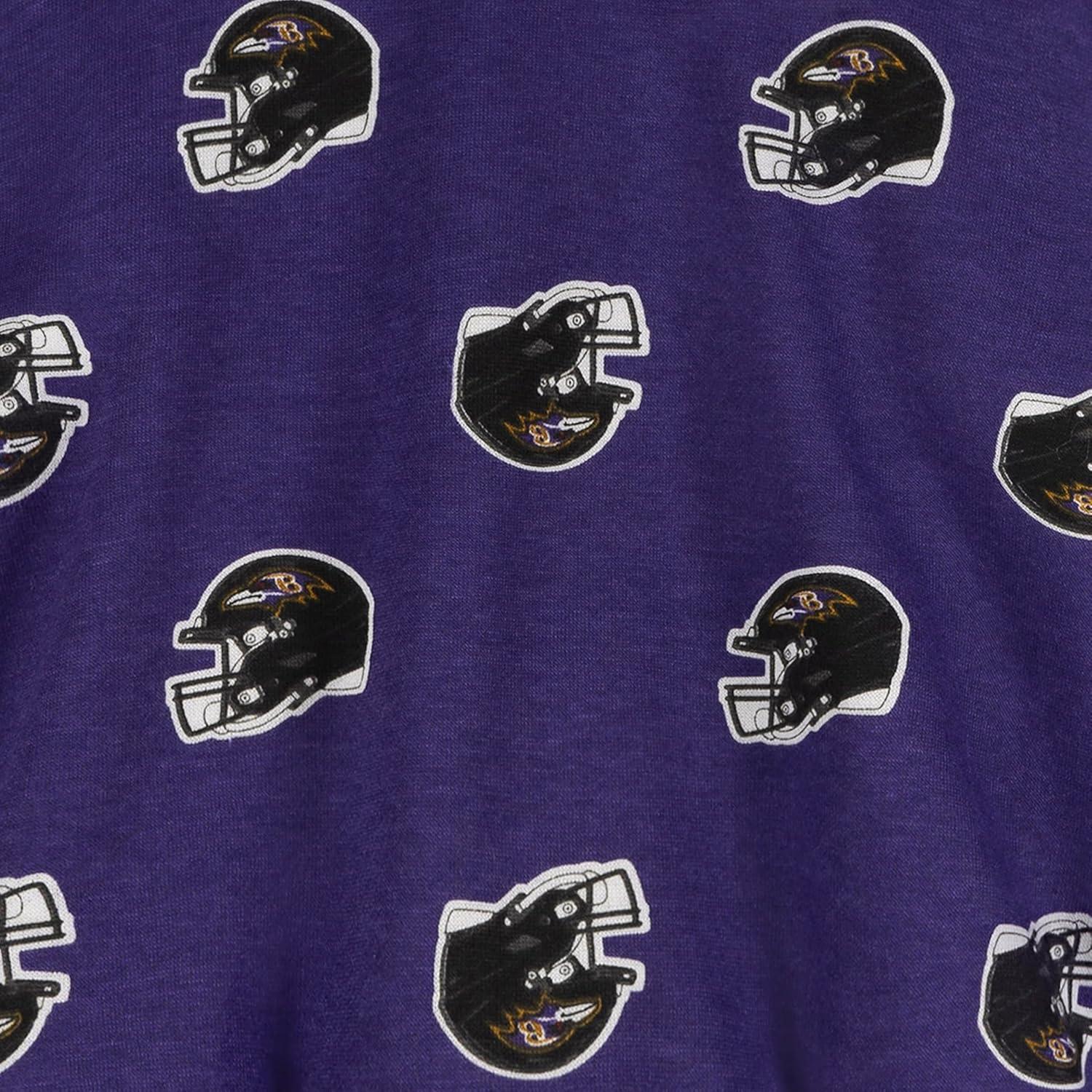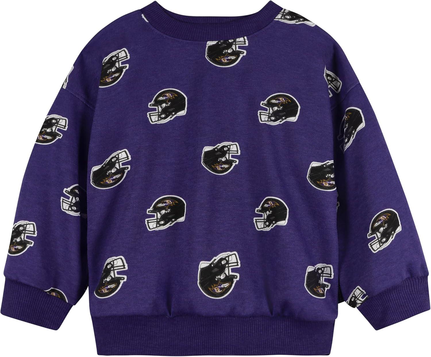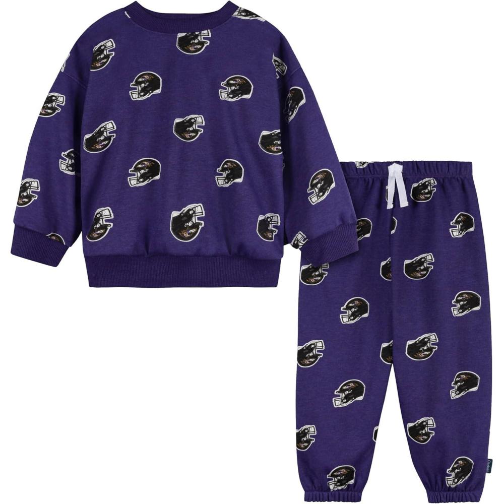 Dress your little Ravens fan in this comfortable fleece set, ideal for cooler weather. The soft fleece fabric keeps them warm, and the drop-shoulder sweatshirt offers a relaxed feel. Ribbed trims at the collar, cuffs, hem, waistband, and ankles provide a snug fit. An allover helmet print adds a touch of team spirit to this cozy baby or toddler outfit.