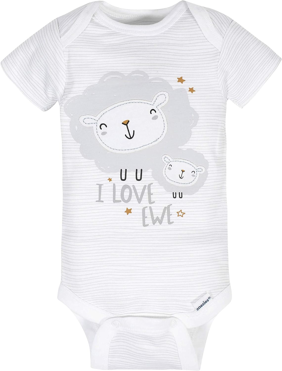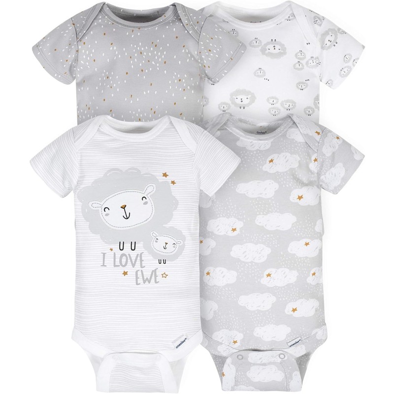 Both mom and baby will love this 4-pack of short sleeve onesies bodysuits from Gerber! This set includes four gender neutral onesies bodysuits with soft and sweet screen-print and puff art. Baby will feel snug and cozy no matter what the day has in store thanks to the 100% cotton rib fabric. The soft, muted colors easily pair with any pants or shorts in baby's wardrobe for a complete look. Dressing and changes is easy on mom with the expandable lap shoulder neckline and bottom snap closure that's positioned higher on the front of the bodysuit. When the day is over, toss these items into the washer and dryer with the rest of your laundry! This set from Gerber offers spectacular value with outstanding quality you can trust for your baby.