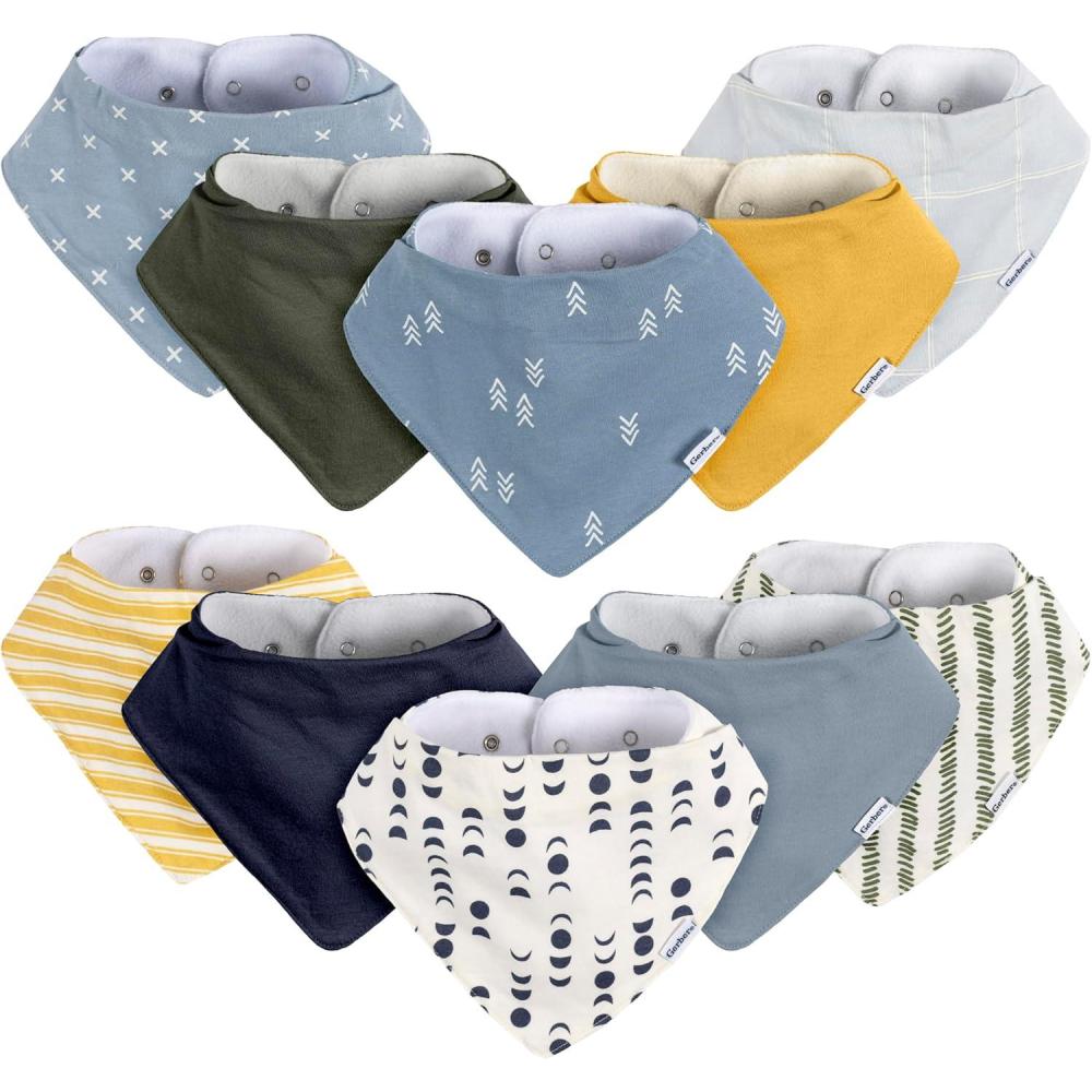 Keep your little one's outfits both neat and fashionable with these modern bandana bibs. This set includes ten gender-neutral baby bibs, showcasing an assortment of patterns and solids in white, brown, gray, and orange – an excellent match for any baby outfit! The back snap ensures a secure and hassle-free fit. Constructed from gentle and easily washable fabric, these bibs are the ideal choice for your baby boy or baby girl, whether you're in the comfort of your home or out and about! These bibs are a true baby essential item.