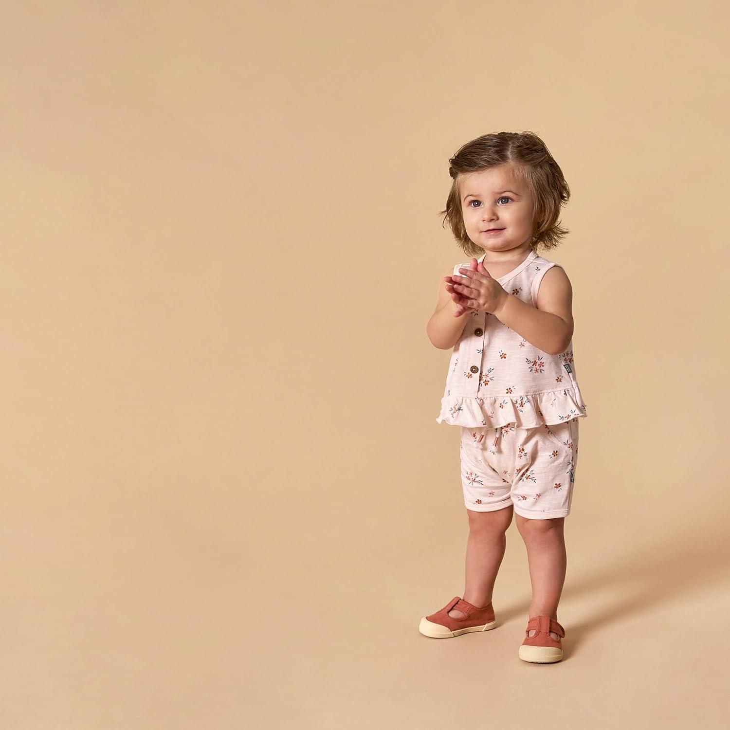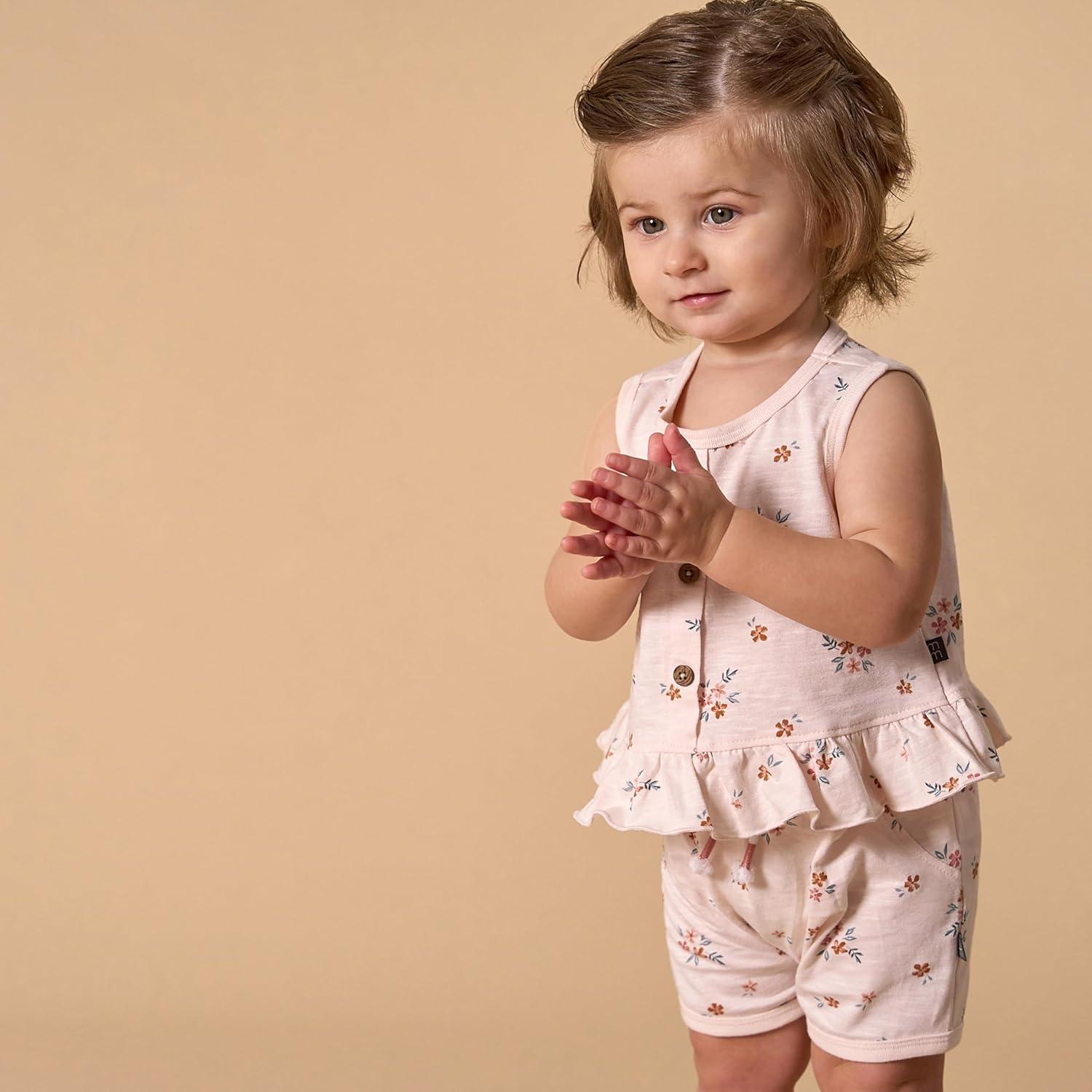 Add a touch of everyday elegance to your baby girl’s playtime wardrobe with this modern moments™ outfit set. Crafted primarily from soft cotton with just the right amount of stretch, it’s designed to keep her comfy while she plays. The peplum top features an adorable ruffled hem with faux wood buttons down the font for a stylish touch. On the shorts, comfort-stretch material at the waistband and leg holes provide flexibility for all her adventures.